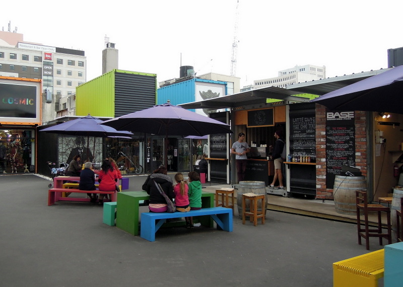 Soon we found Re:START, a post-quake outdoor shopping mall created from shipping containers. We first heard of it from our Auckland host, an architect. There were coffee shops, food vendors, a bookstore, and gift and clothing stores — many (if not all) of them relocated from other storefronts that had been destroyed or blocked off.