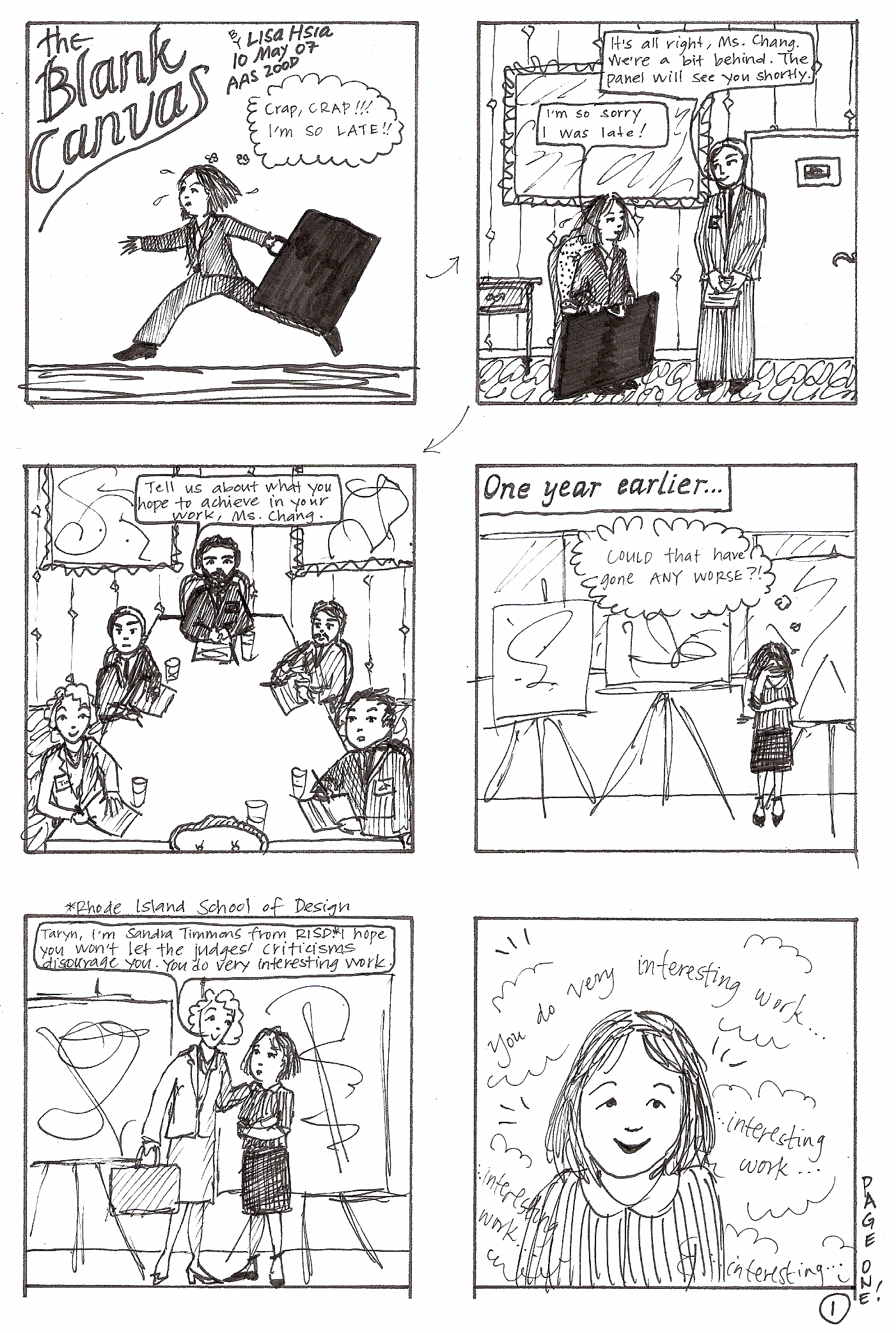 In lieu of a DDP or TWP for today, I present to you page one of my first ever real attempt at drawing a comic. We have a short story assignment due tomorrow in creative writing class, and DWL encouraged me to try a comic, so I did. I spent a long time working on a story, and then realized it wouldn’t work. I’ve progressed a lot as a writer, but I’ve never really attempted a serious story-based comic, so I just wasn’t capable of translating that more complex story into comix. So I gave it up and came up with a much simpler, more focused story instead, to be told over four pages (six panels per page).