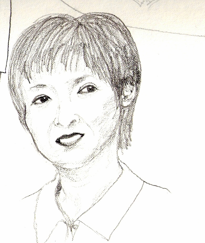 Busy sort of day today, even if I didn’t start till 10:30. Wrote my morning pages, read bits of Further Chronicles of Avonlea for fun, bummed around a lot feeling torpid, did an entire week’s worth of Artist’s Way reading and exercises, did my singing practice accompanied by decoupage cutting, got severe twinges in forearms so did many stretches from my book (must remember to do this regularly, every day, all day long — get another session in before end of work day today), wrote one more page of my “young authors’ faire” story which is coming along nicely (pirate-ship bed for the little boy! splendid idea, must make sure there’s no rigging he can accidentally strangle himself on), did some more drawing practice including several quick cartoony sketches, a couple of fun free sketches (my anatomy is getting much much better; could actually diagnose and fix some problems this time), and this Asian woman who actually looks Asian (from a photo):