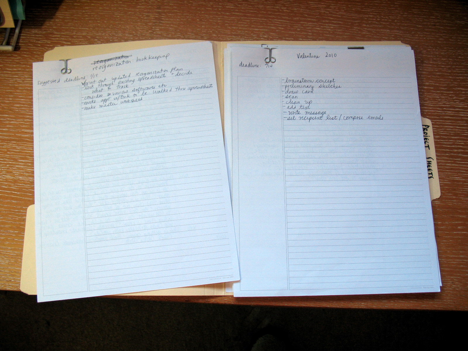 project sheetsThey have supporting documents paper-clipped to them.