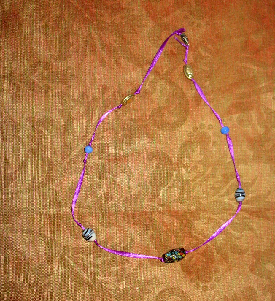 - strung a bead and ribbon necklace to see how it would look (the background fabric will be the lining for the yoga mat tote I’m working on!)