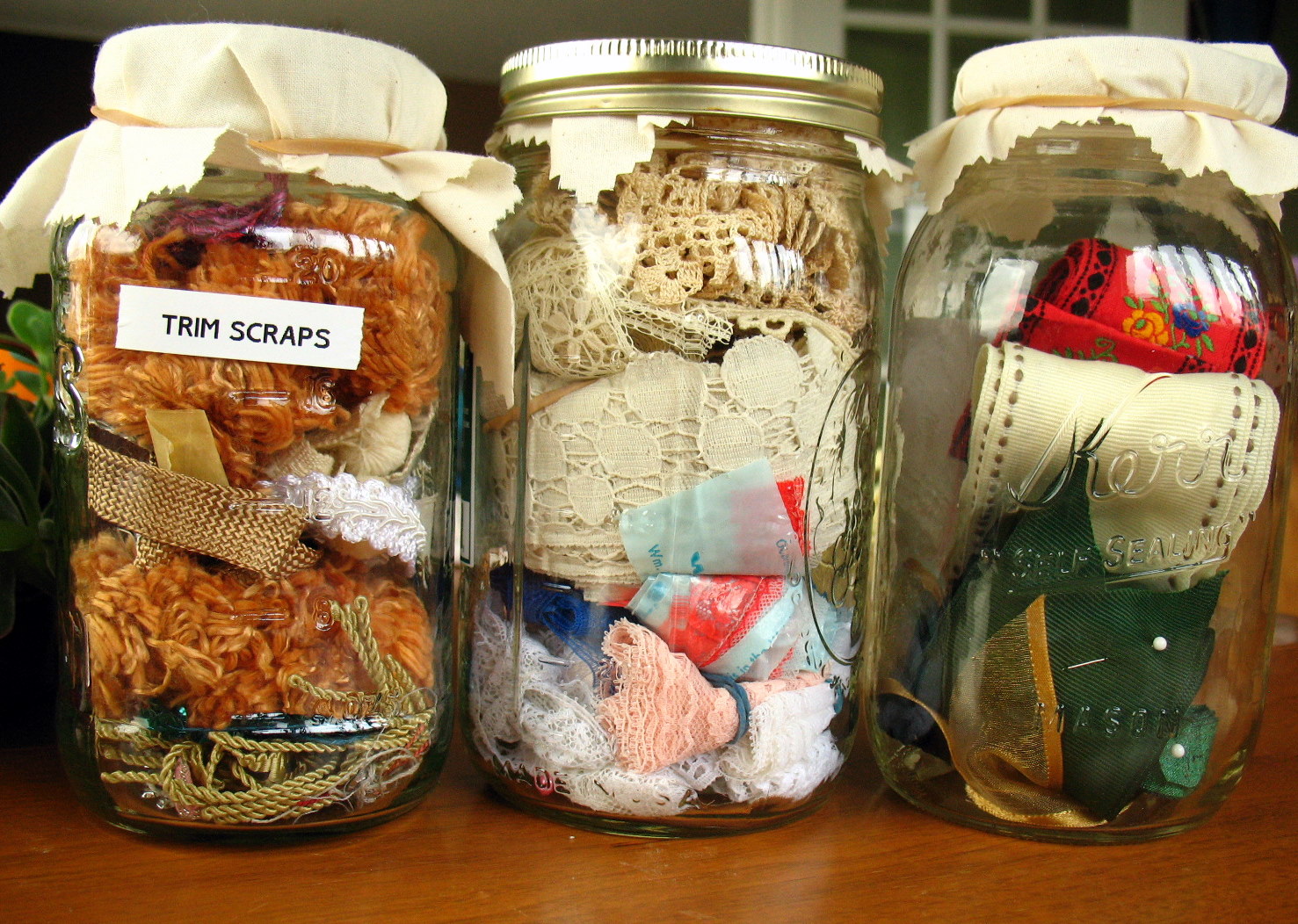 so I pawed through my trims box (also really disorganized!) and pulled out some of the trims. I put lace in one jar (with my beautiful Lacis finds at the top), ribbons in another, and little short pieces of random trims in the last jar. I still don’t use trims all that often, so it remains to be seen whether this method is a good way of organizing them — but there is just something very appealing about pretty things kept in clear glass jars. Maybe now I’ll use them more!