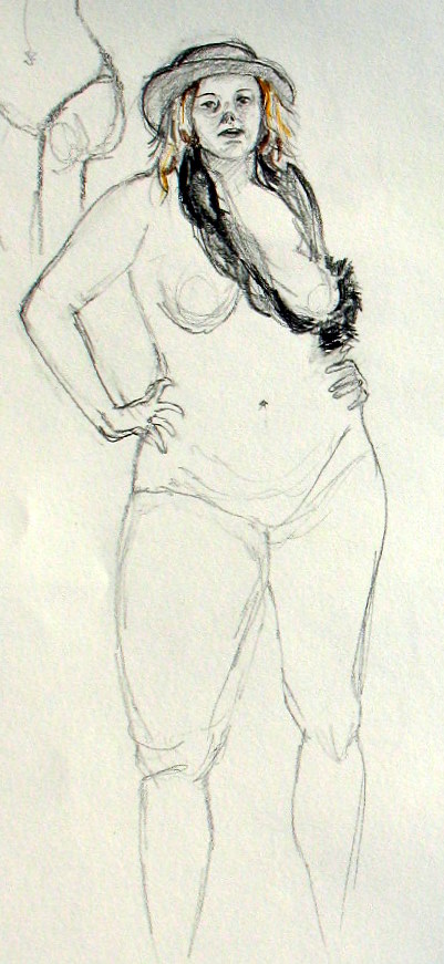 Another thing I’ve noticed since I started crafting is that I do particularly well with models who use textiles as props. When I’ve been doing a series of not-so-hot sketches, and I’m feeling cranky and down on my ability, if the model pulls out a piece of cloth, I’m suddenly all inspired again. I look at the page and I know just where to start, all the lines and proportions flow, and I even manage to capture the model’s attitude much more vividly. When I drew the sketch at left, I was coming off several poses of angular men and one of a lithe, beautiful girl, and none of them had worked and I was feeling very cross and wondering whether the whole morning was going to be a wash. Then this fabulous model stepped onto the platform, filling it with her presence, and whipped out this piece of black gauze and a black velvet hat, and I was off and running. I wish I hadn’t had to cut off her feet, but I couldn’t see them; another model was lying down in front of them (and I couldn’t draw her, though I wanted to, because other artists were in my way).