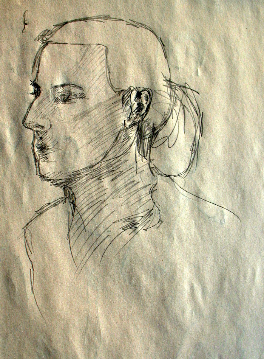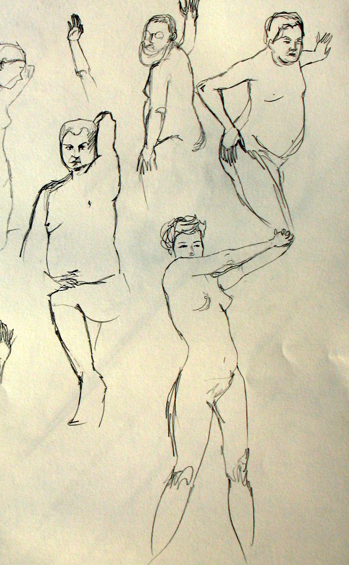 nonwhite models who were there today. As a person of color myself (I kind of hate that phrase, but it’s so serviceable I use it anyway), I value opportunities to have others like me to serve as models and inspiration, just to counteract all that perfect whiteness we see in magazines and on film and TV. On the other hand, those magazine photos aren’t just of white women but are of white women of particular proportions and features, so I guess it’s just as valuable to draw models who are larger, curvier, flatter-chested, more androgynous, or what have you — and in that sense, almost any regular human being will do, because most of us don’t look like magazine models! This is what I love so much about drawing from models in real life. Even the youngest, slimmest, and most “perfect” girls or guys will still have soft tummies and skin folds — and usually messy hair and dark circles under their eyes, to boot. And every body is so different, just as every face is so different; I get to practice from reality rather than from airbrushed ideals. I have a fat file of photos saved up for drawing practice, taken from photos of models as well as normal people, but these images are just so flat (literally and figuratively) compared to the active, breathing, imperfect presence of real individuals posing just a few feet from me.