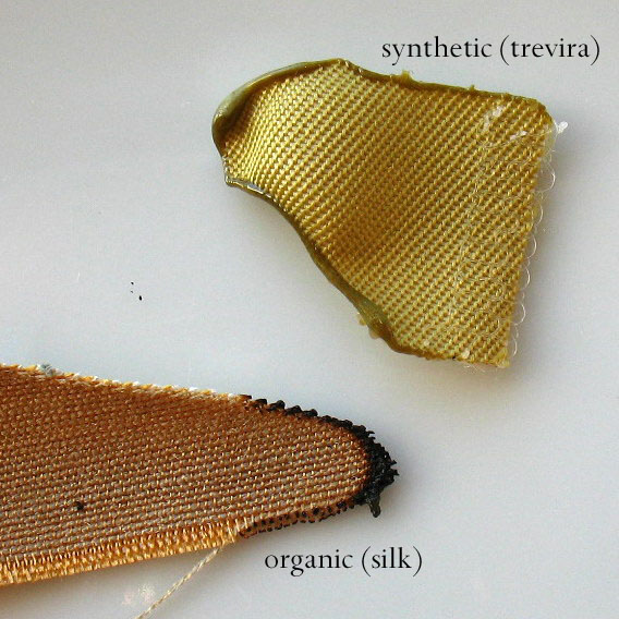 Knowing what kinds of fibers went into a textile can tell you a lot about how the textile will behave. This is not just true for fabric, but also for materials like yarn. Burning a little piece of fabric can tell you what’s in it, because most synthetics are basically plastic, and so they’ll melt in a flame, rather than burning the way a cotton candle wick does. I burned a little cotton scrap, and it made a neat, brown edge, like artistically fake-aged paper. I cut off a corner of my new taffeta, and the edge blackened, hardened, and turned glossy, like resin. I did two more scraps to share with you (click on the photo and you’ll see even more detail):