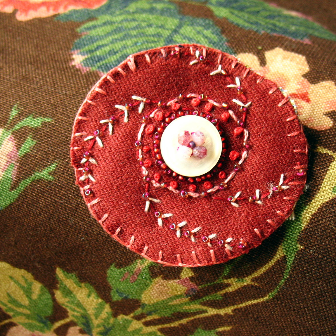 I finished the brooch I showed you on Wednesday. (Sorry, I know the photo is fuzzy — it’s been ridiculously overcast here, after a couple of days of unseasonable sunshine!) I decided that all it needed was some French knots around the bead ring, to mirror the beads themselves. It’s a rather large brooch and Erik said the stitching makes it look like a baseball, which I guess it kind of does.