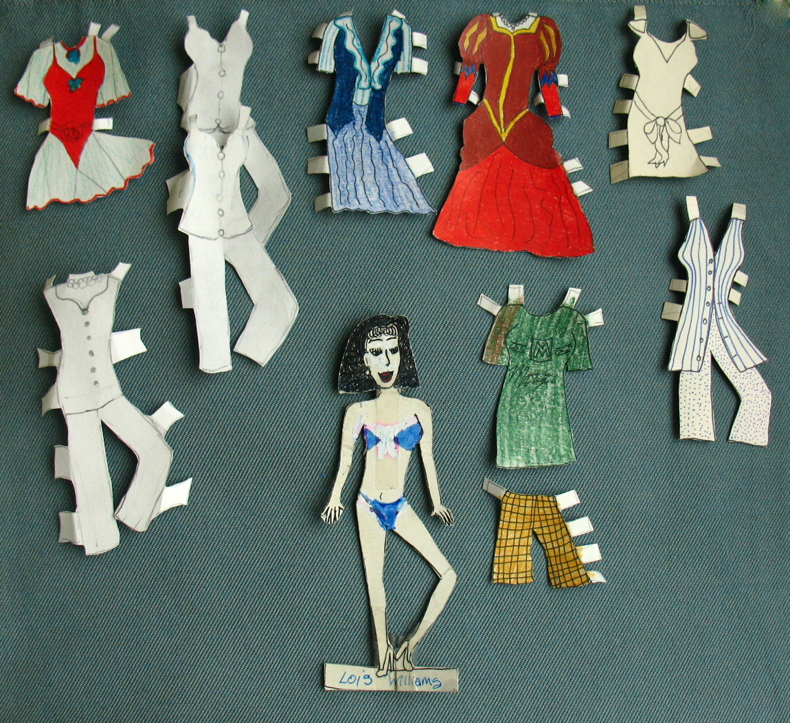 In a recent trip to my parents’ house, I discovered four boxes of paper dolls, each containing at least one doll and her entire wardrobe. So far I’ve documented two of these boxes. The first, at left, contains “Lois and Terri Williams” (embarrassingly named by myself), who I must assume were meant to be sisters. Terri must have been the neglected younger child, for while Lois has several striking outfits, Terri has nothing! Poor Terri will remain forever stuck in her underwear.