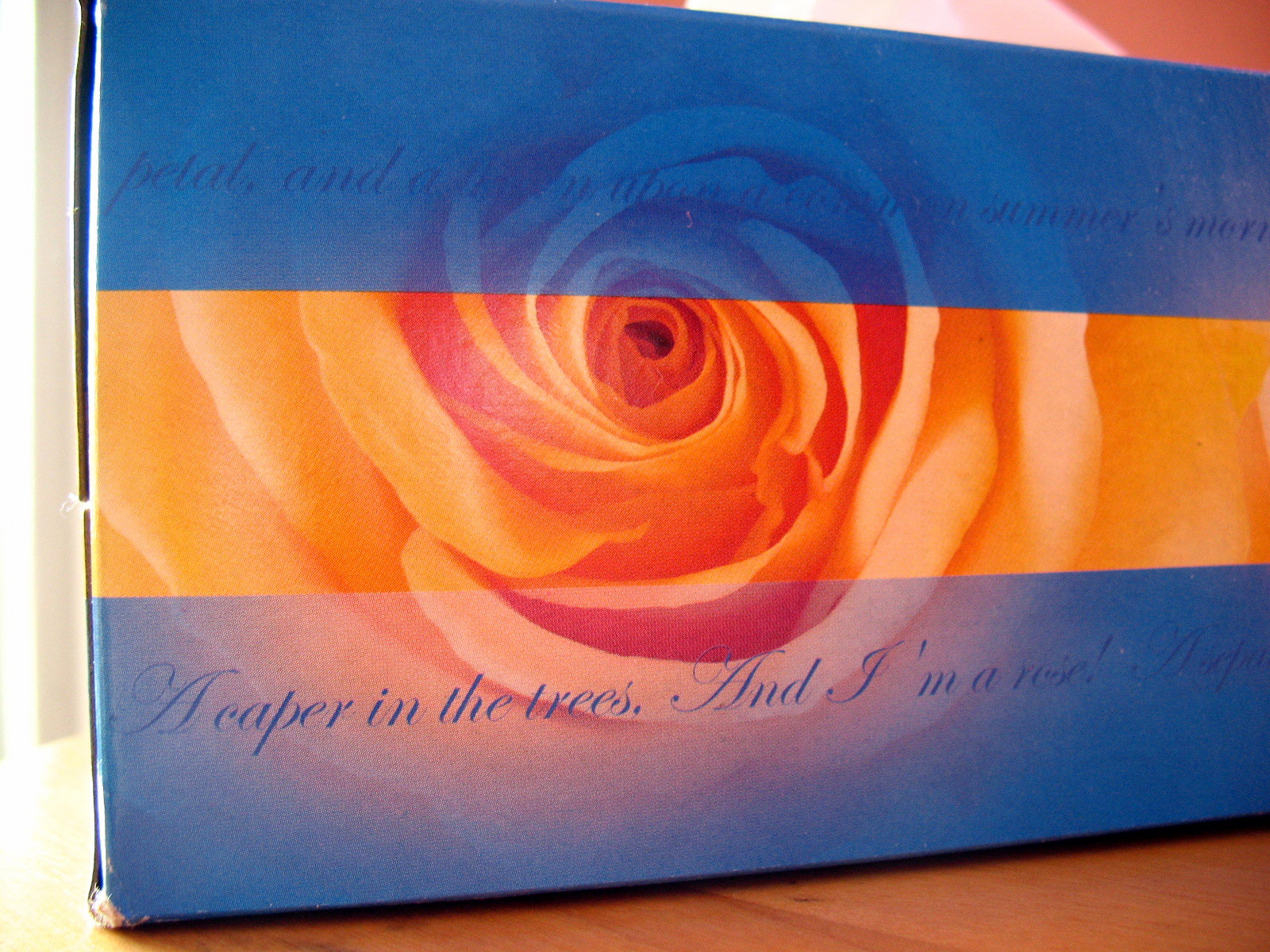 The words ran around and around the box in elaborate cursive script, a wannabe-romantic font to go with the roses. We hadn’t noticed the text at first because it was printed in blue… on a blue background.