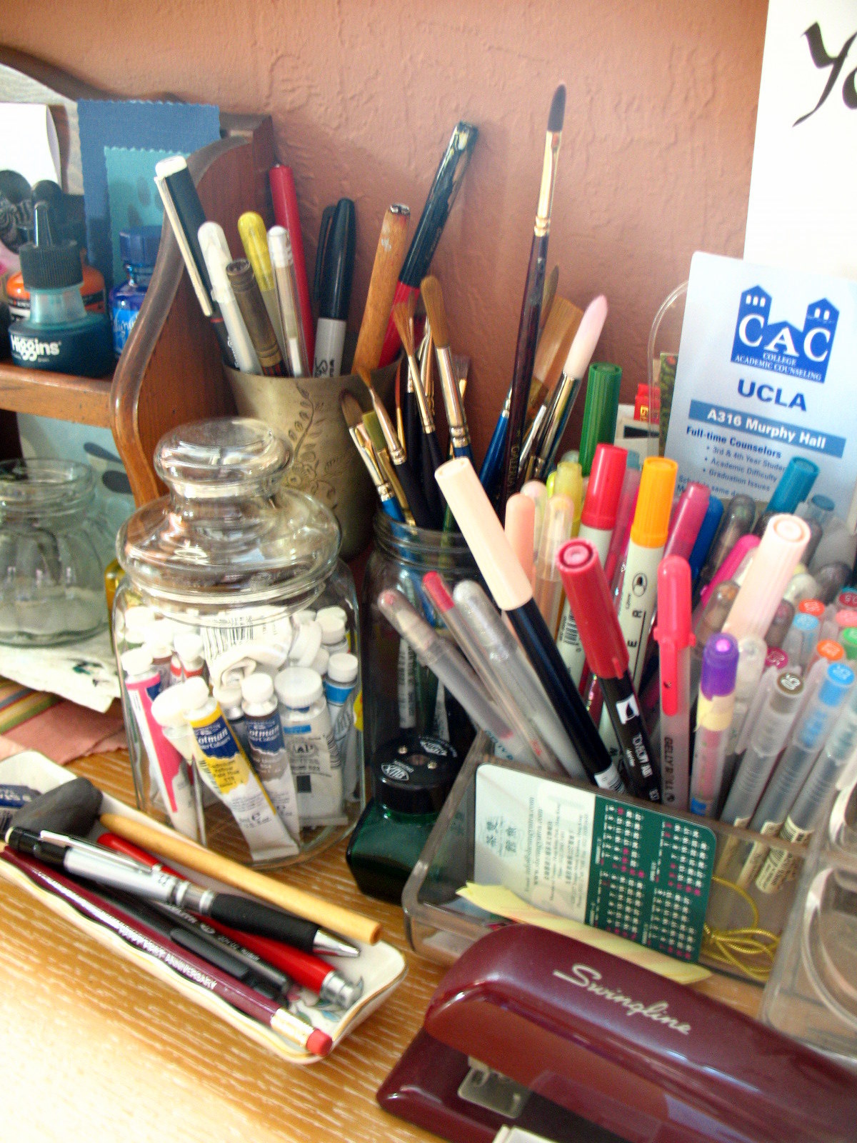 It’s remarkable how much happier I feel about the desk, now that it more accurately reflects what I do at it. It’s visually appealing and offers easy access to all my creative tools, and the cards and quotations arranged around it remind me what’s important. Also, it’s a bit silly, but I feel so much more legitimate as an artist after reorganizing my desk to support my goals; I’ve quite literally put my art-making front and center. All in one place, I can point and say, “This is where I work. This is what I do. These are my tools.” It’s a very nice feeling.