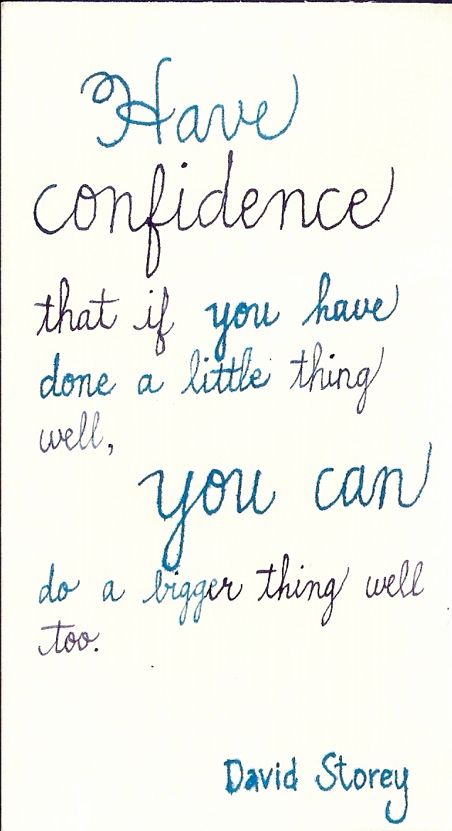 For the moment, it’s tickled my creative spirit to imagine these really going into a book. When I’ve had time I’ve tried to do the quotes properly, trying out the text in pencil first and planning out the spacing, but mostly they’ve just been freehand. At right is the original freehand rendering of a quotation attributed to David Storey. I mixed two inks and wrote out the text in cursive. I love the way the blue and turquoise inks flowed together, but I didn’t pre-test the inks or nib on this paper, so the ink bled. At second glance I also thought the loopy cursive looked cramped on the small (3″ x 6″) paper. So I decided to redo the quote, as if I really were preparing this as a page of a coffee-table book.