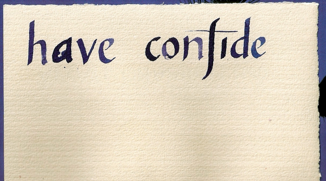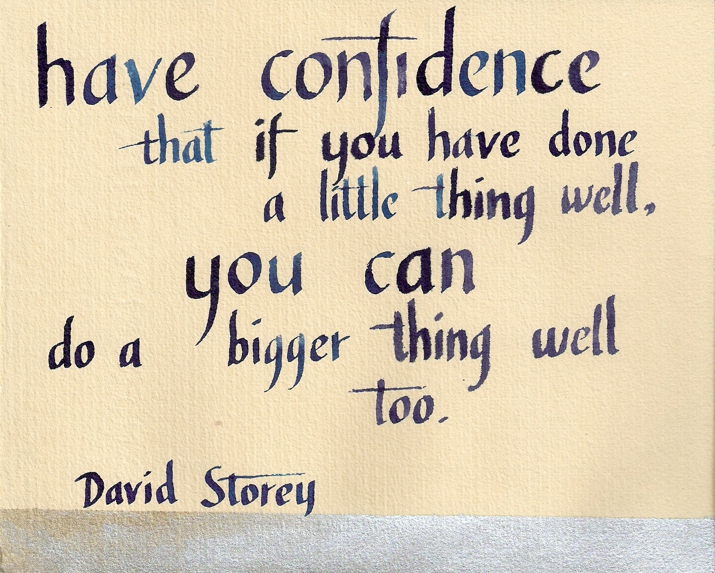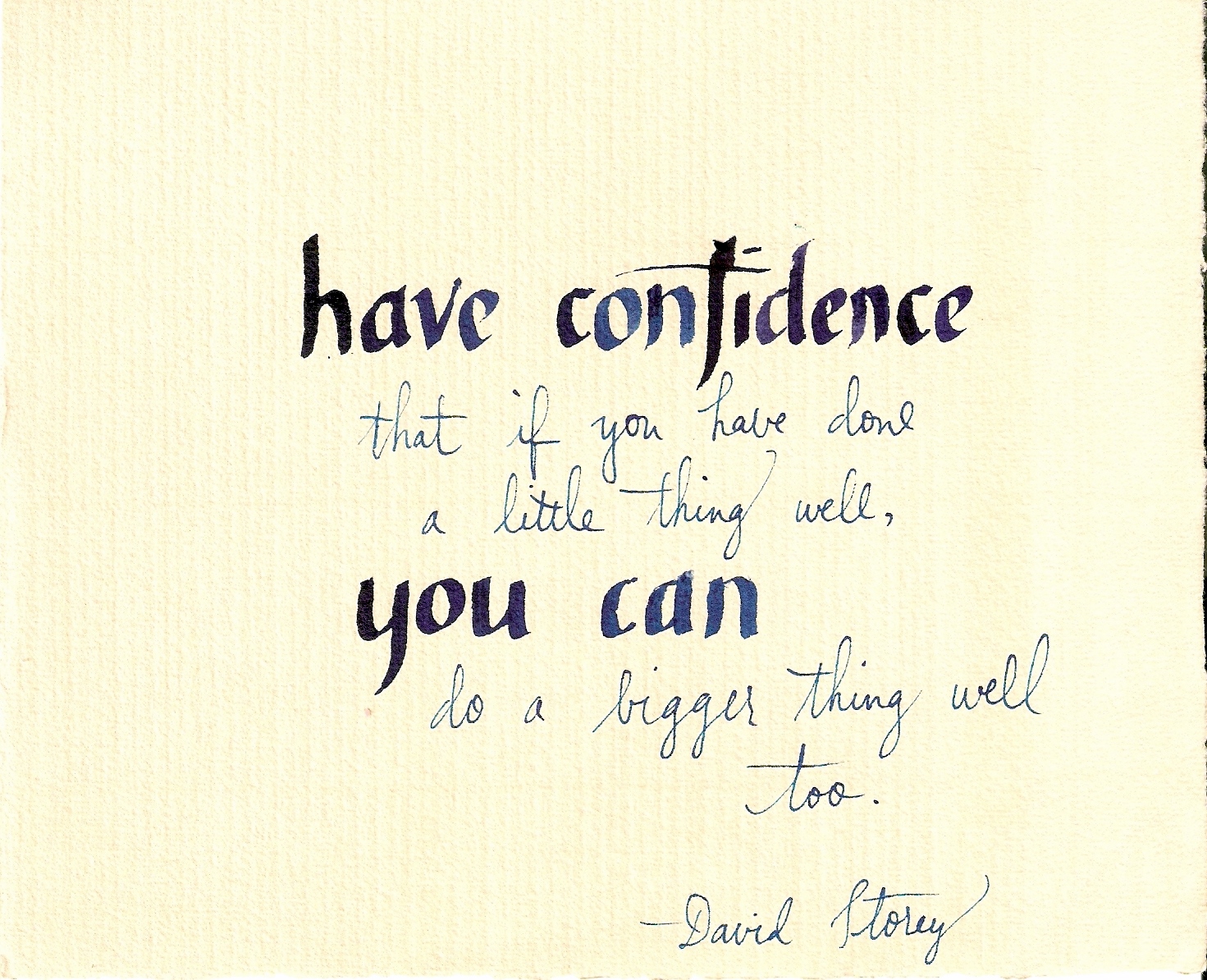 But I liked the new “settings,” so I tried them again. This time I used the same size paper but I turned it the other way. This sheet also had a line of silver painted along one side. I liked my original idea to make the words “have confidence” and “you can” larger than the rest of the text, so I wrote those using the big nib, and switched to a smaller version of the same nib for the rest of the text. It’s not bad, but I decided I don’t like the look of so much of the same calligraphy style.