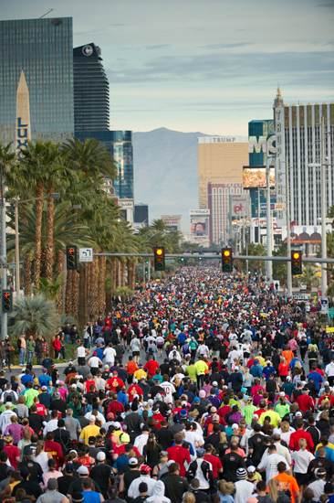 The part that felt most authentic was watching Jason run in the marathon, but that also had its share of the surreal. They closed the Strip to auto traffic, so when we walked Jason to the starting line at 6:30 AM, we could stand in the middle of Las Vegas Boulevard and watch the sun rise over the Sphinx at the Luxor… along with thousands and thousands of other runners and their supporters, like a horde of slow-moving zombies (with the occasional runner warming up with high knees or side jumps) converging inevitably on their shared destination. All day long, as we traversed the race course to cheer Jason on at agreed-upon mile markers, the runners kept coming and coming: thousands of male and female Elvii (or Elvises, if you prefer), women in bridal veils (there was an optional detour through a wedding chapel), wiry fast athletes and slow, lumbering recent couch potatoes. While our friend did his 26.2 miles, we walked, ate breakfast, walked some more, took a nap, and walked again to wait for him at the finish line. After he did, we sat for a time on the asphalt, then walked (or limped, in my case; this was the day of the 14 miles) back to the hotel, rested again, went to dinner, came back and talked, went out for a late-night snack (leaving Jason happily recovering in bed), then came back and collapsed into bed. That was the only full day of our trip.