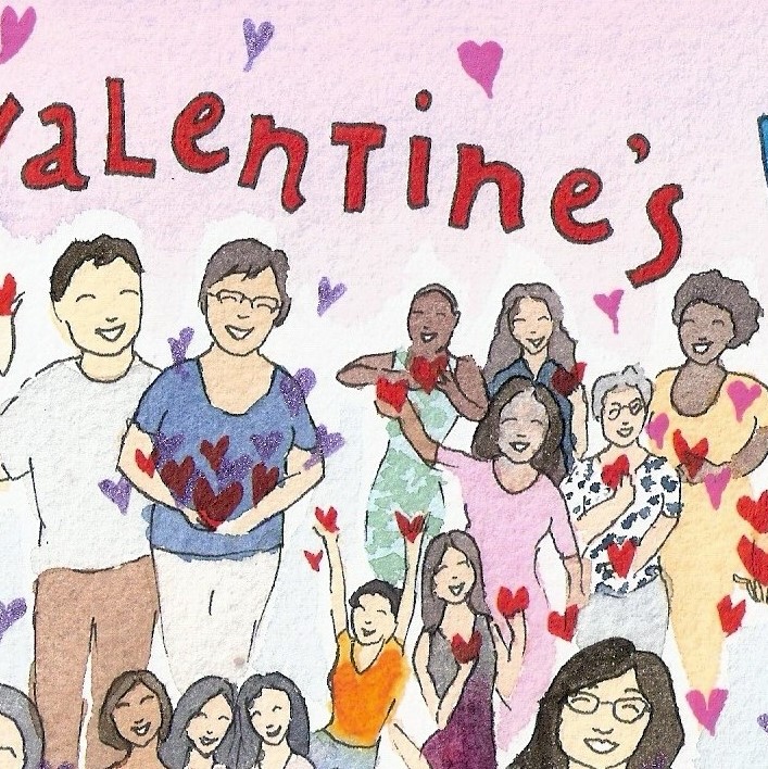 That night, I talked it over with Erik, and he suggested a much better theme: community. I realized that while I’ve grown a lot in the past year, so much of it is due to the people I’ve connected with, who’ve supported and inspired me in so many ways. You, the blog community, have been a huge part of this! So I decided this year’s valentine would be dedicated to my community, in thanks. I developed a new concept and started sketching it out, but soon realized that (yet again) there was too much me in it. So I changed it again, this time to the final Where’s Waldo?-esque drawing with me standing off-center and surrounded by family and friends.