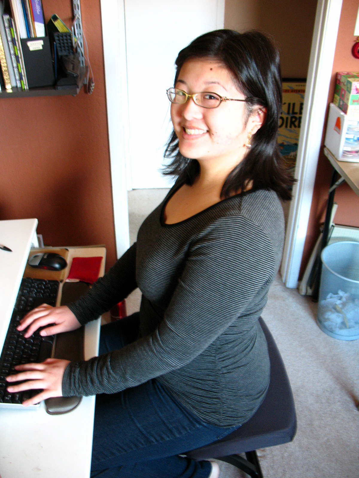 Here’s another angle on me in the kneeling chair, which gives you a cool view of my computer workstation. The site I’m browsing is Mo’s at themousemarket.com. π