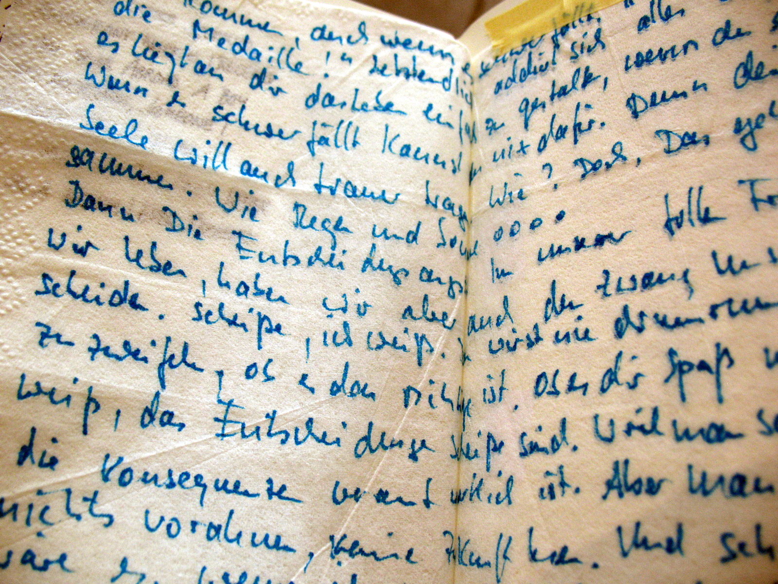 This was probably my favorite sketchbook of the 10 I viewed. It was beautifully put together, with neat text and line drawings laid out on the page just so, alongside envelopes containing restaurant napkins. Erik noticed that all the pages were masking-taped along their long edges, probably to make them easier to turn.