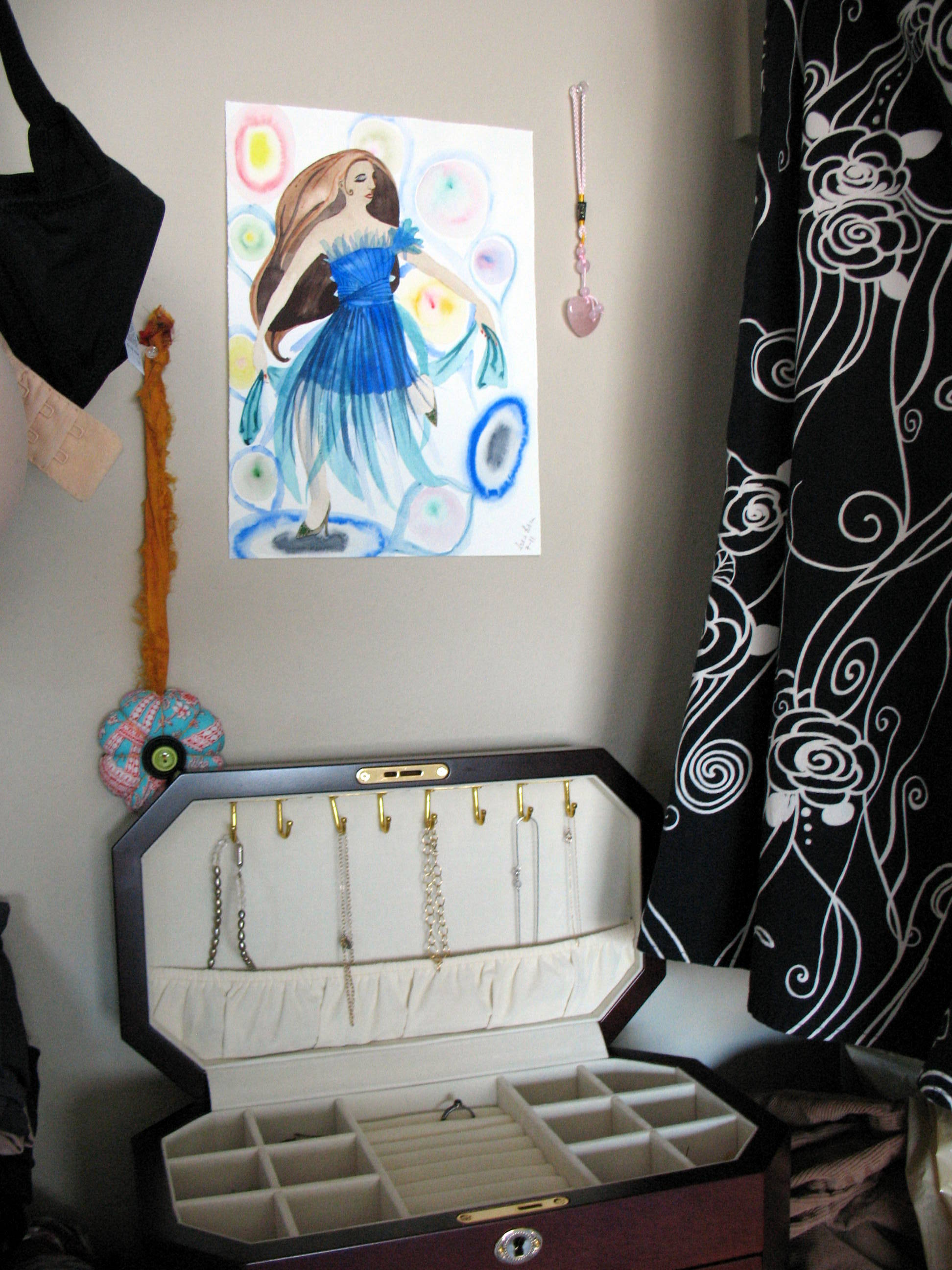 Now that I could open the jewelry box, I put my earrings and necklaces back into it, and even hung up some decorations on the wall above: the painting I made several weeks ago, a rose-quartz heart from my friend Tina, and a sweet flower-shaped pincushion which was a gift from Mo of The Mouse Market. It’s not exactly a gallery setting, but it’s worlds better than before.