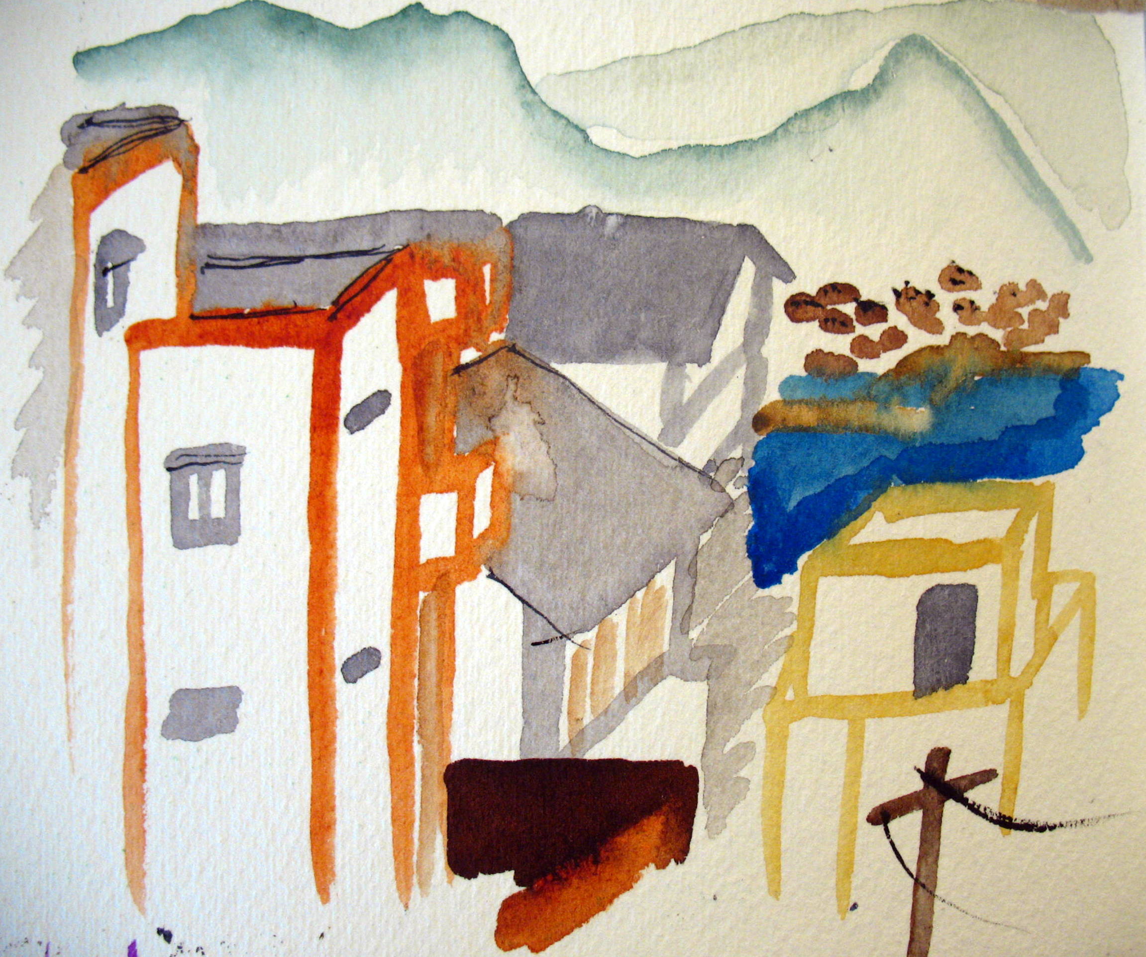 This is the first painting I made on our trip: the view out the third-story window of a taro-dumpling shop in Jiufen, on the north coast of Taiwan.