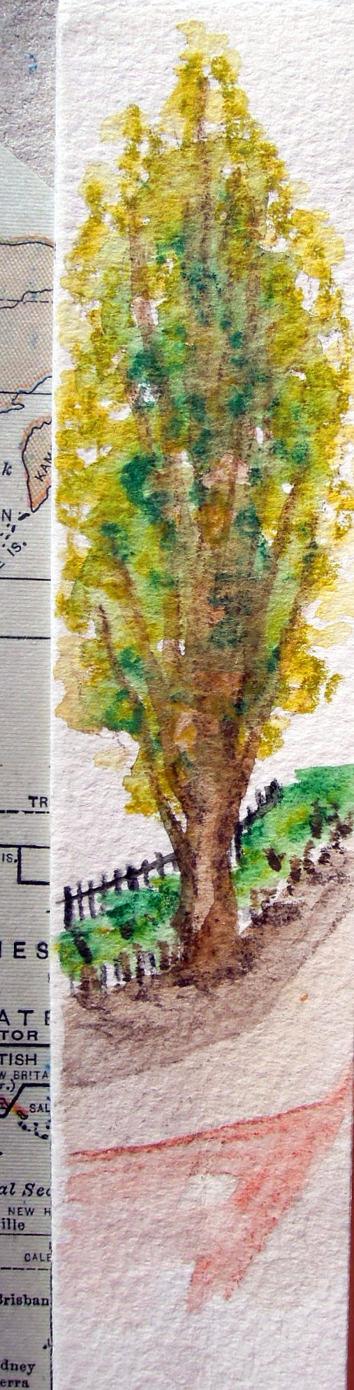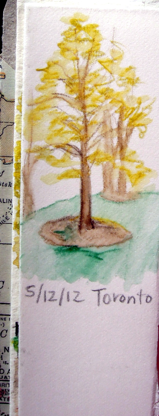 After the craziness of St Lawrence Market, we fled across the street to this quiet park, where we sat on the lawn, sipped our juices, and watched the pigeons. A bride and groom came by with photographers; when a little girl called out to them, “Are you married?!” the groom responded, “Not yet!” I took off my sun hat and decided to paint some of the trees into the margins of my sketchbook.