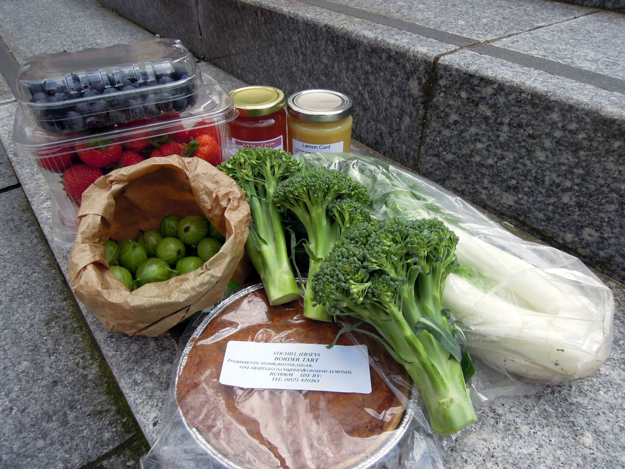 We’ve already stir-fried the bok choy with garlic, roasted the gooseberries with sugar (raw, they tasted like very tart crunchy apples; roasted, they tasted a bit like sour tomatillos — I didn’t put enough sugar!), made headway with the jams on toasted muffins and in yogurt, and stirred the blueberries and lemon curd into oatmeal (along with some cardamom seeds, since I bought cardamom for last week’s kedgeree). Oh, and that tart is nearly gone. The little kitchen in our flat is getting lots of use!