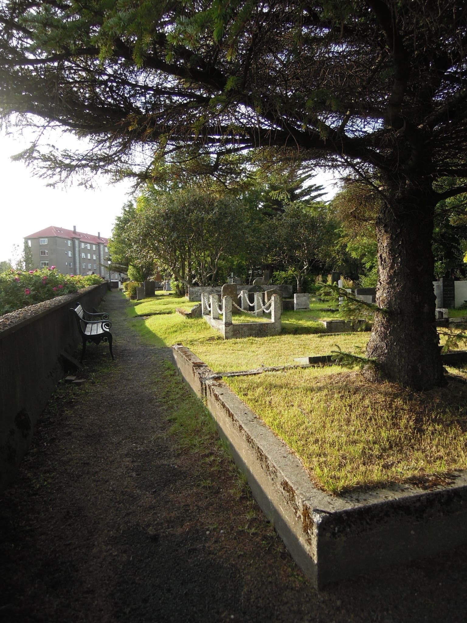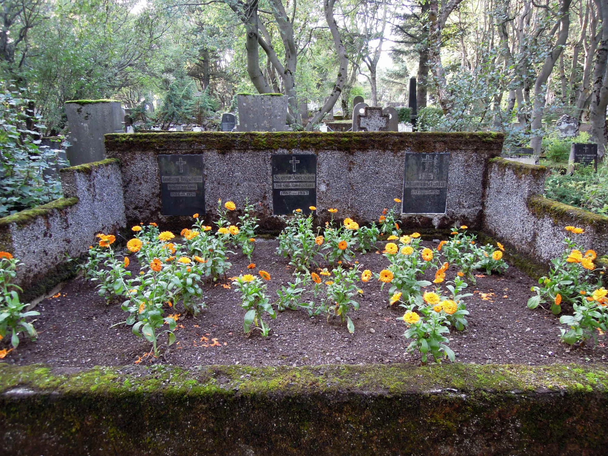 At the Necropolis in Glasgow, the graves were mainly those of prosperous Victorians, laid out in fairly neat long rows with thick grass in between. The tombstones were large and often ornamented, and there were many imposing tombs and monuments. But here in Hólavallagarður, there were almost no tombs, just an astonishing diversity of headstones and wooden crosses in rectangular bordered plots.