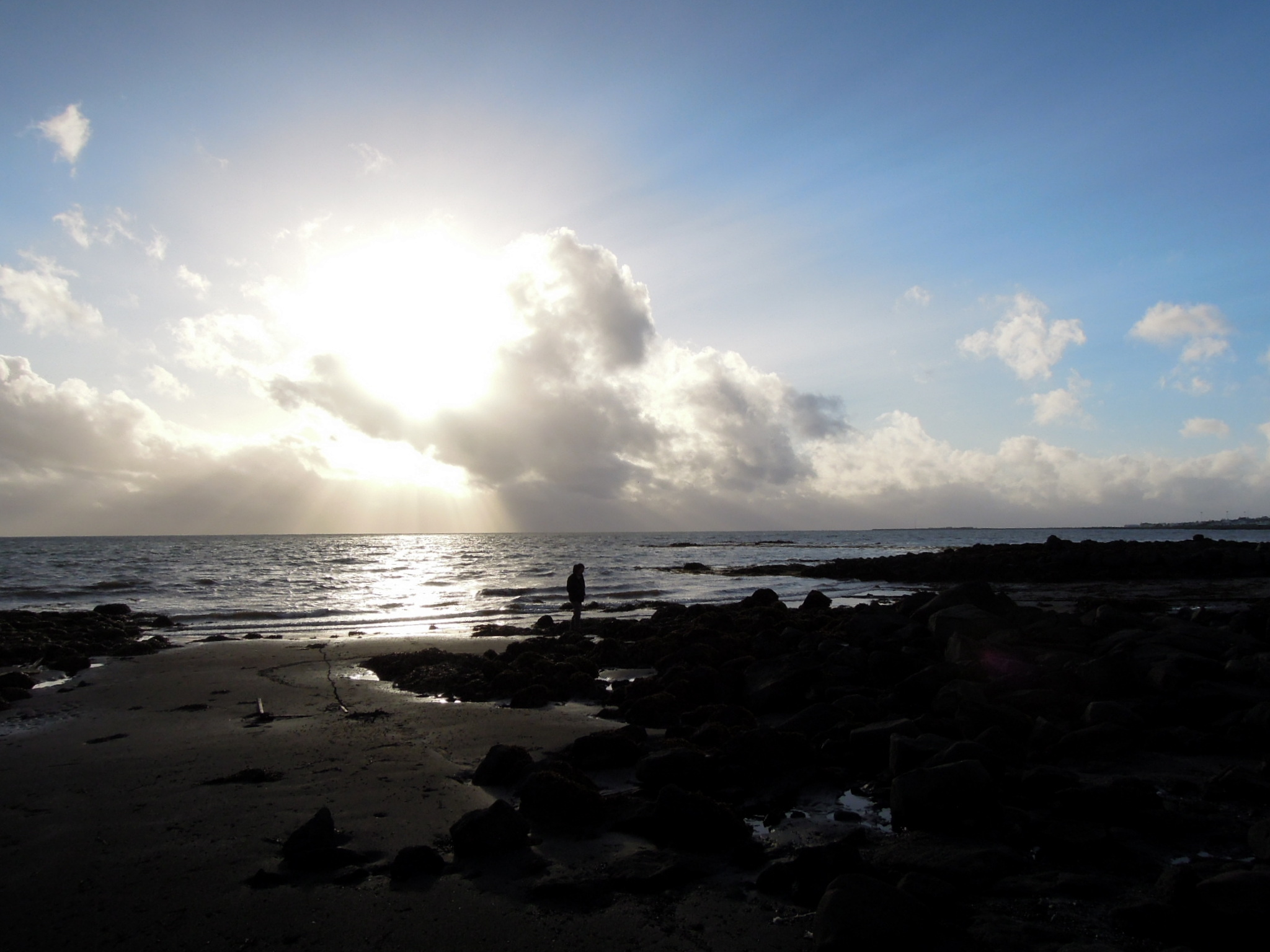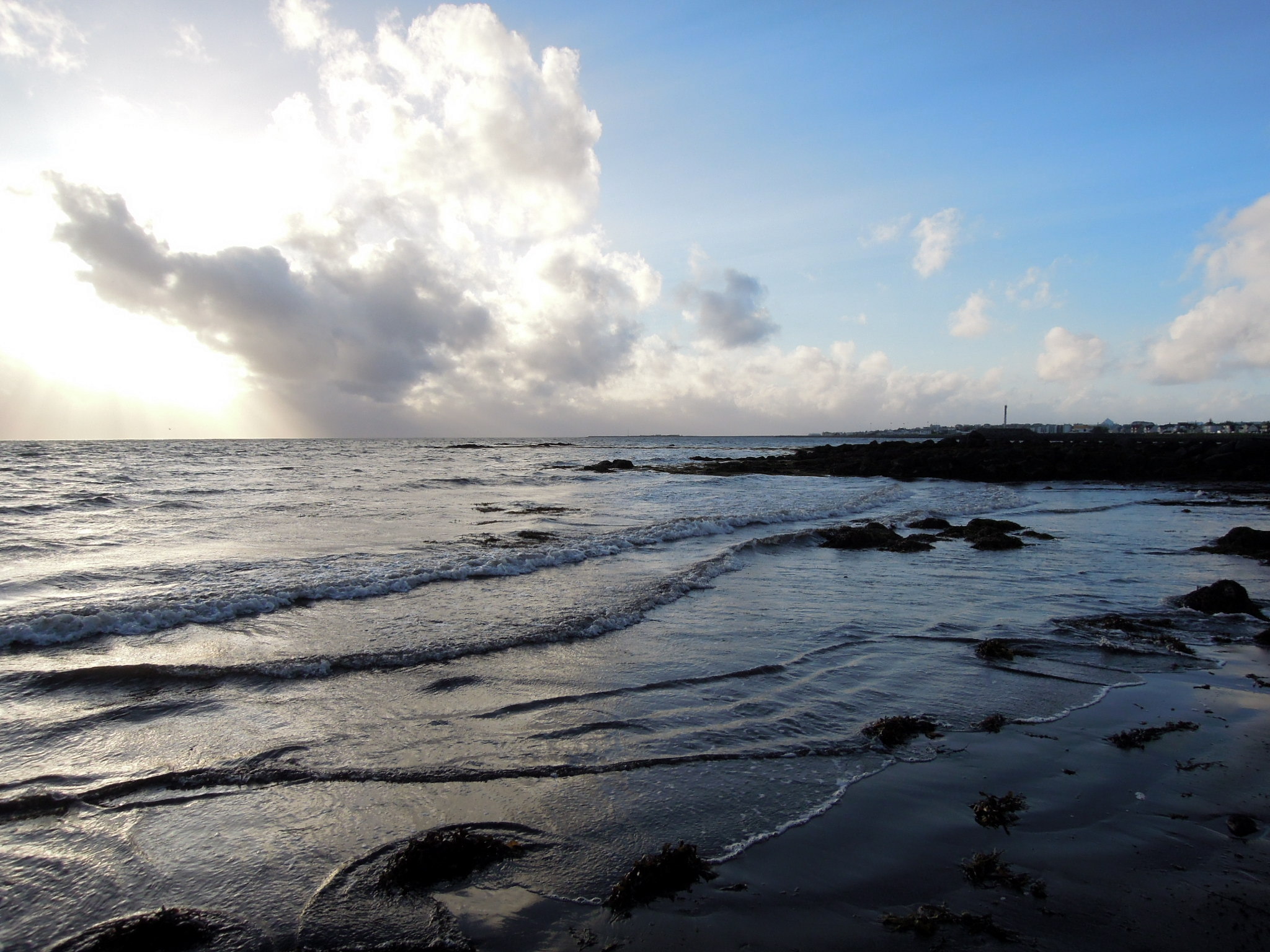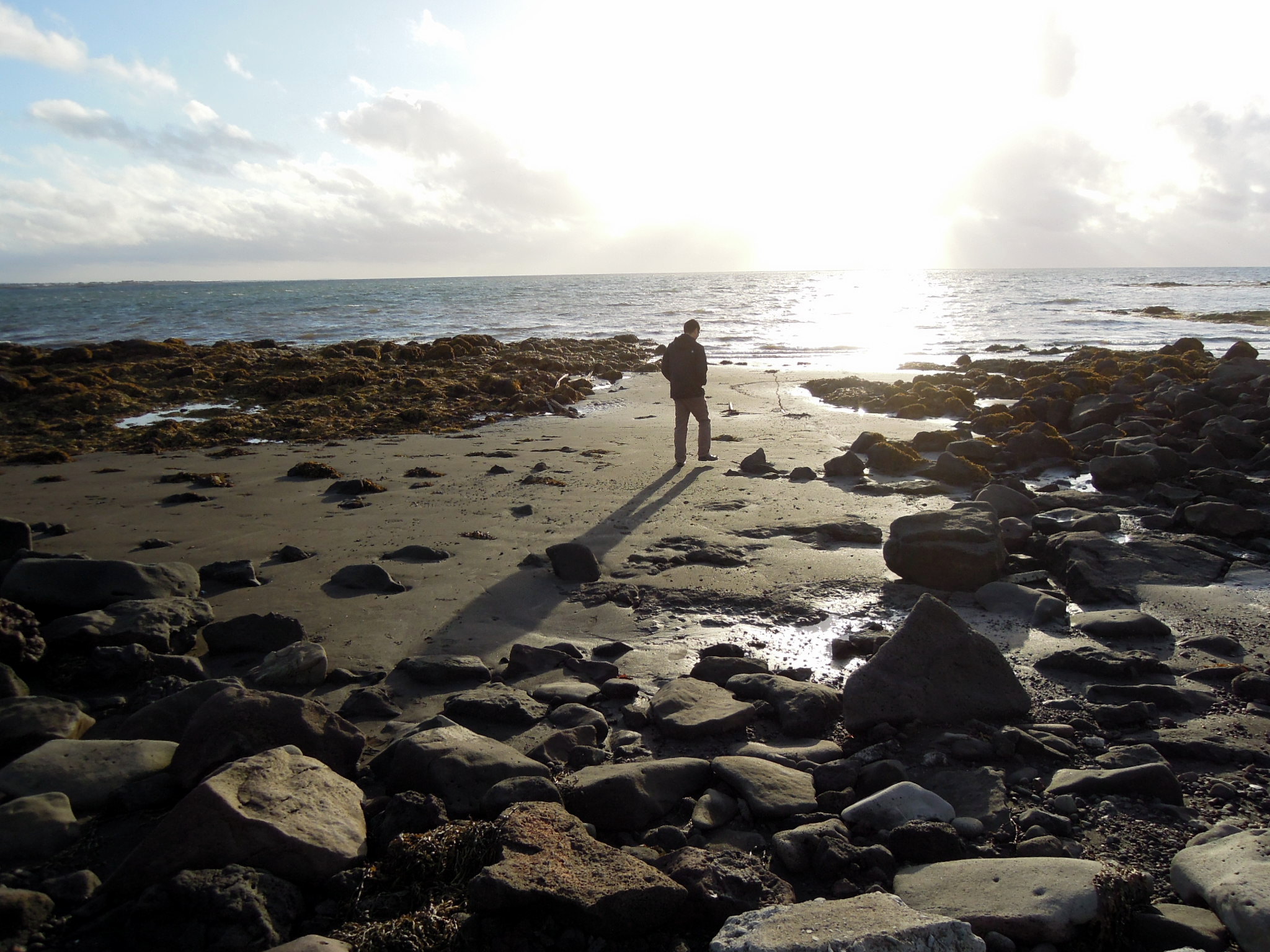 Erik found a little path down to the water, and we stepped over rocks and seaweed and amazing, velvety dark-grey sand. The sun was on the horizon looking like something out of a painting.