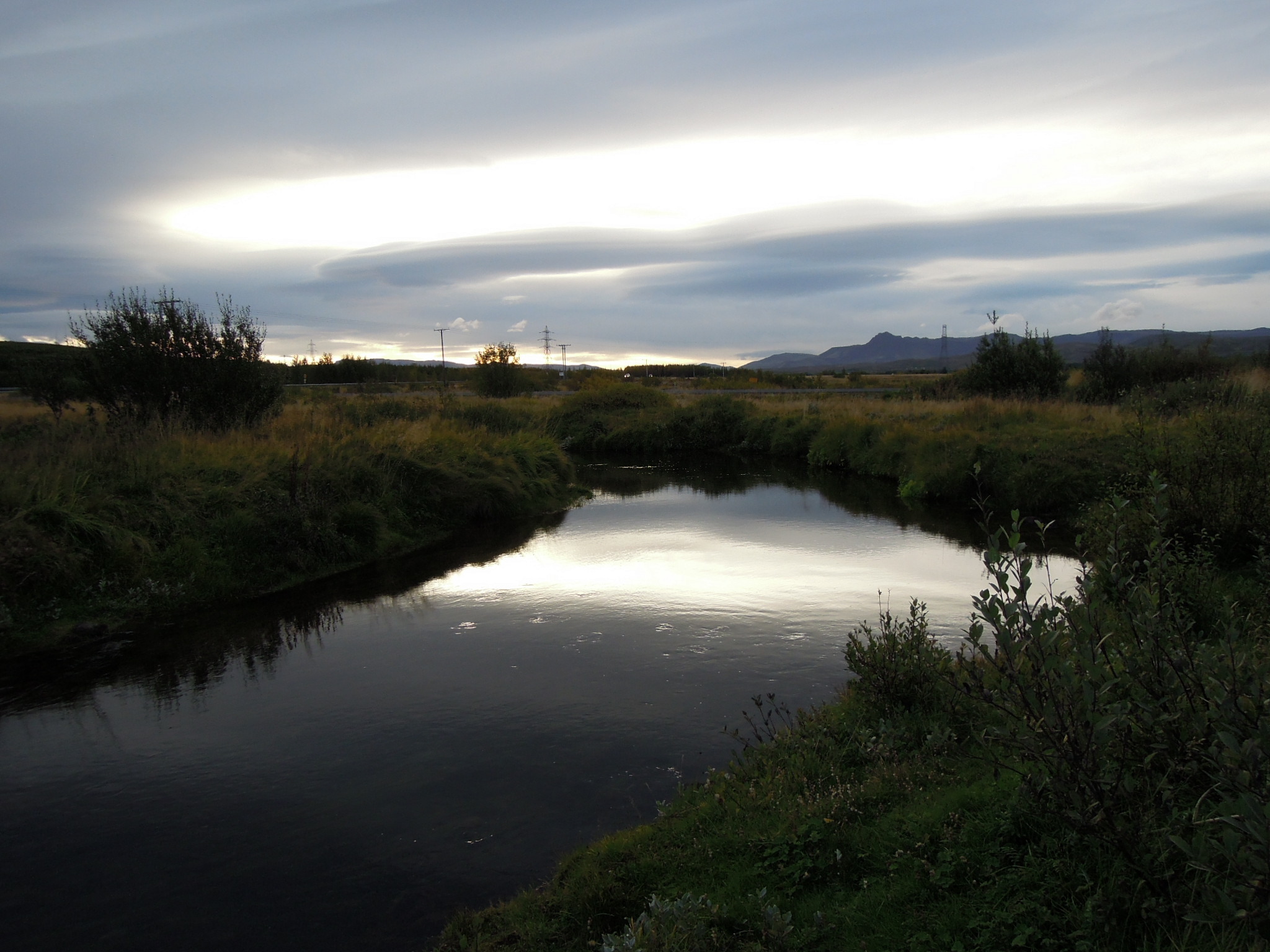 There was a sign that said Rauðhólar, which meant nothing to me at the time, but later I looked it up and found it means “red hills.” According to Wikipedia, they are pseudocraters and are more than 5000 years old! We tried walking around a little, but the only trails there seemed to be uneven horse paths, and anyway there was nothing around but the rocks, and a brook closer to the highway, which we naturally investigated.