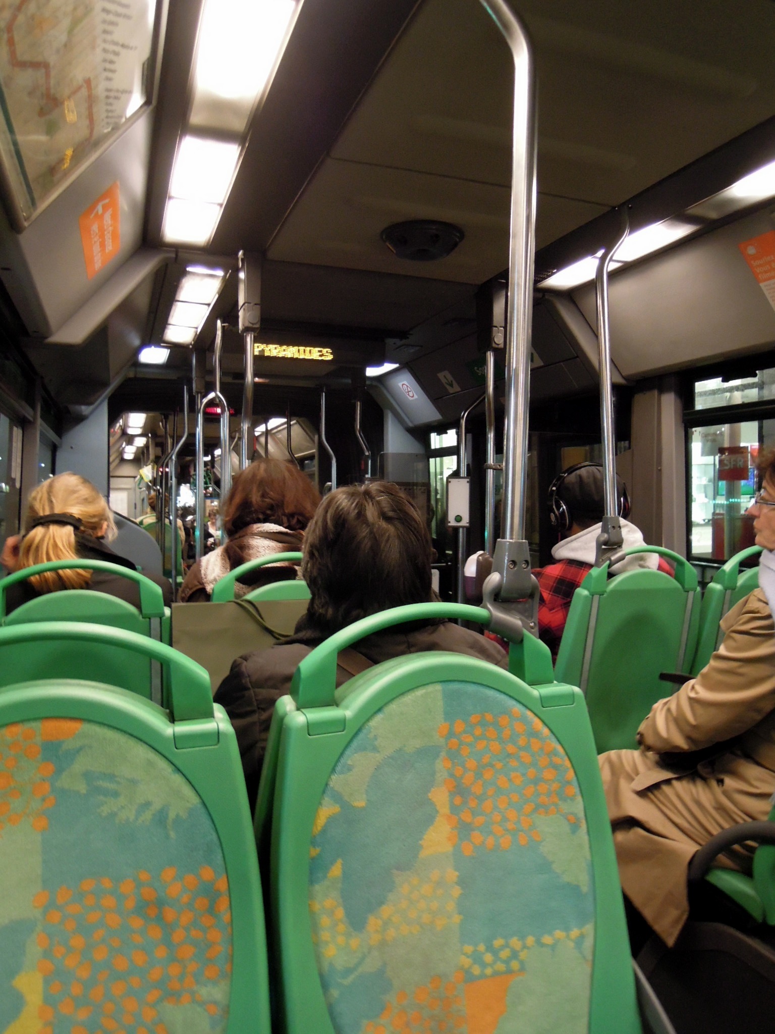 Inside a bus by night