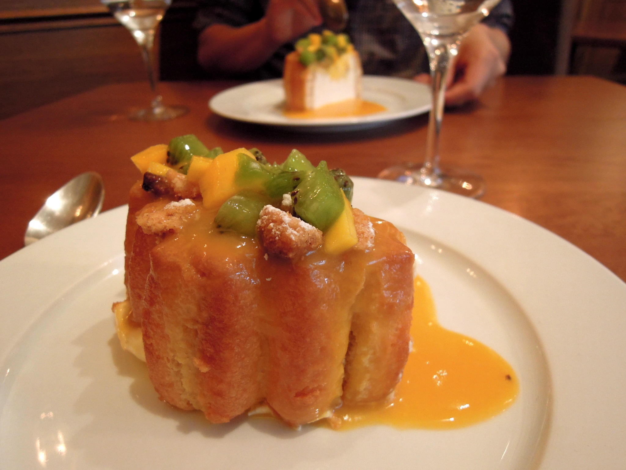 Erik and I had lunch at a restaurant by our apartment, which has been seducing us for weeks with the delicious aromas wafting from its kitchen. We never went before because it’s rather expensive, but when we walked in, the very young chef greeted us warmly, took our coats, and explained everything to us in limited but enthusiastic English. When it was time for dessert he said, “I ‘ave a very nice dessert, but it is for two.” We said that was fine, and he brought us a little cake and a sauce boat. “This is called a charlotte,” he explained. I’d never had one before. He deftly poured the sauce (passionfruit) onto the plates, then sliced the cake down the center, revealing a core of what I thought was vanilla ice cream. Using two cake servers, he placed half the cake onto each of our plates, and said, “Bon appΓ©tit.”