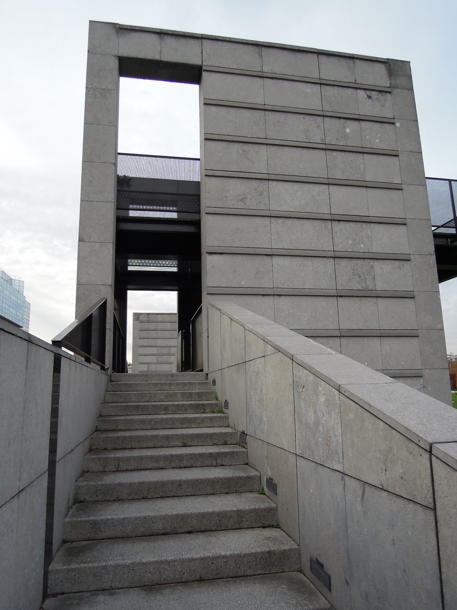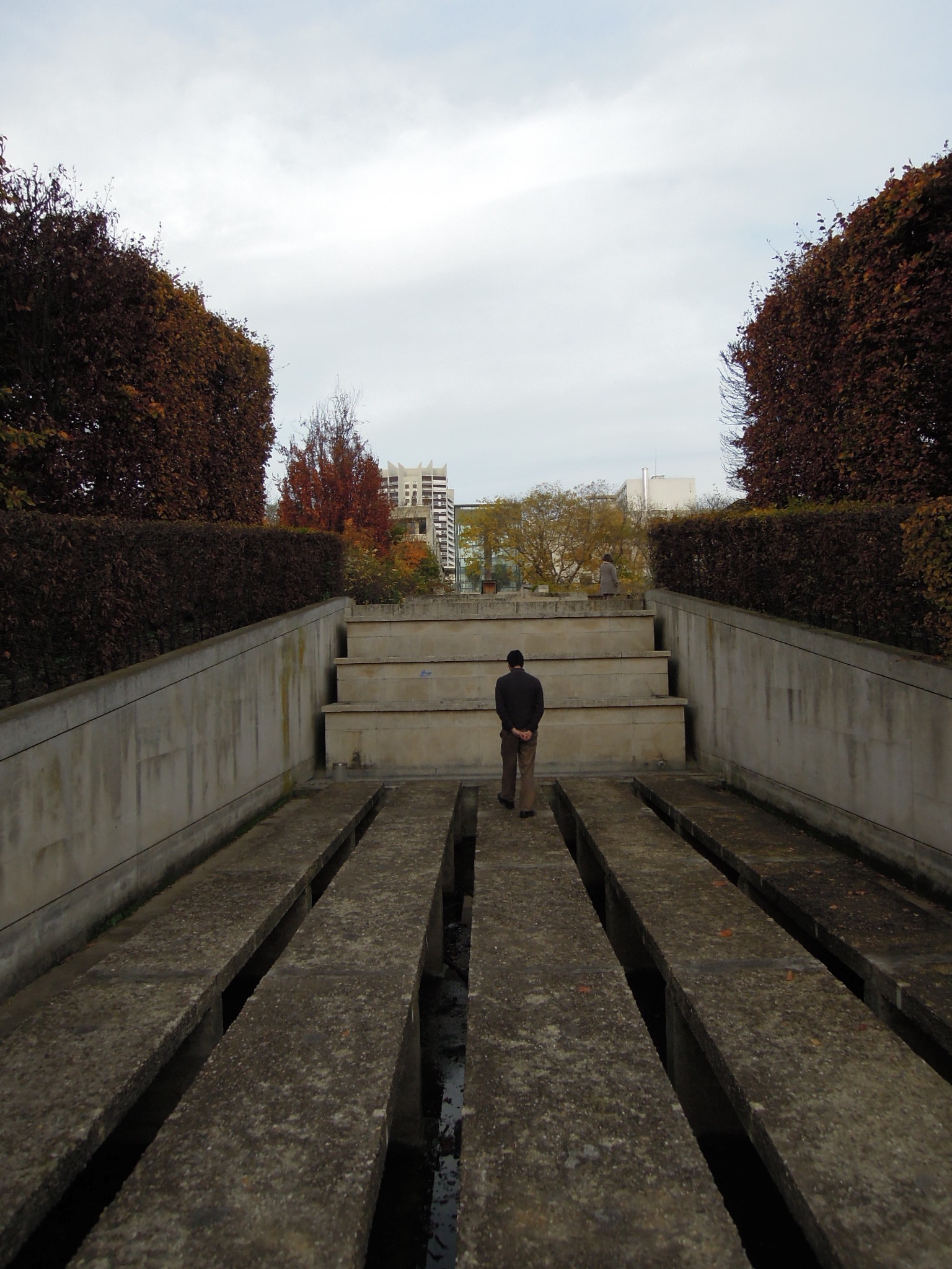 Along another side of the central lawn, there was a series of concrete structures with stairs leading up to observation decks. We saw several joggers making their way up and down these stairs — a good way to get “hill” practice in a relatively flat city! There were also little spaces between the structures, where you could stoop and see out.