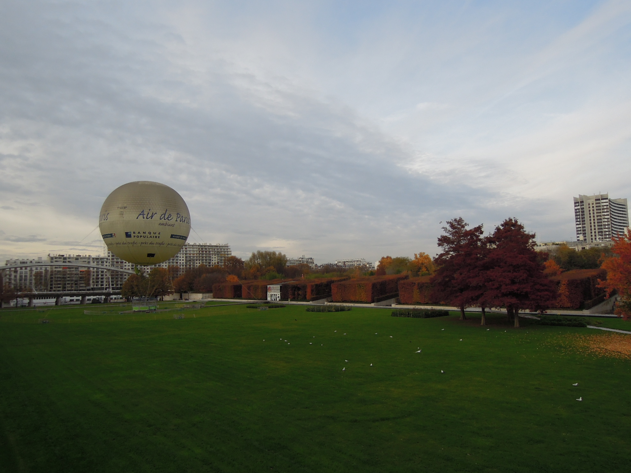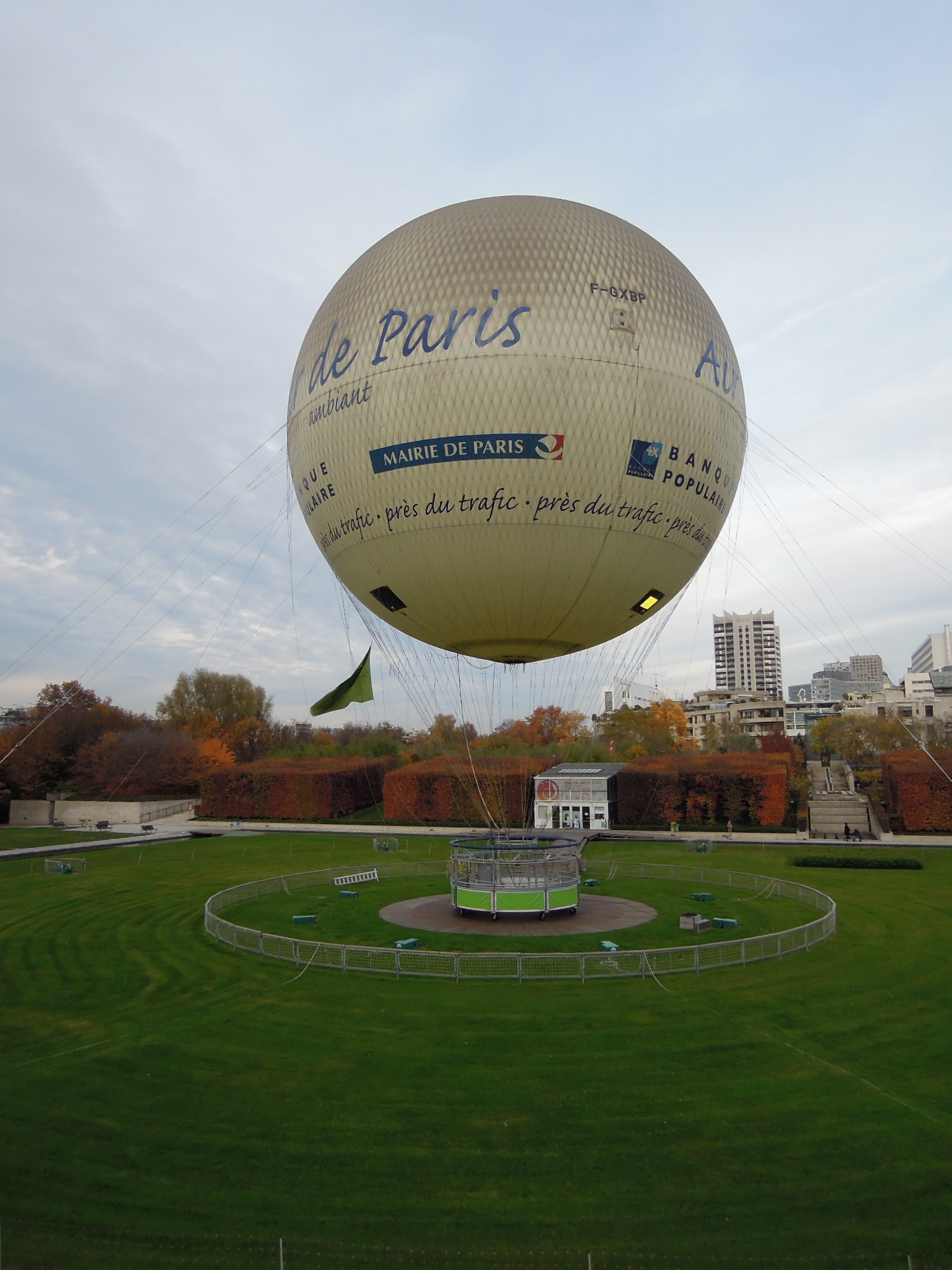 I was talking to Dov a couple of weeks ago (after the Rhys Chatham concert, in fact) and he asked if we’d gone to the Tour Eiffel. I said no, and he said if we wanted a high-up view of Paris without such a crowd, we might try the Parc André Citröen, where there is a stationary hot-air balloon. I thought that sounded marvelous, especially as we’d passed up the opportunity for a balloon ride in Cappadocia in Turkey (do an image search — it’s insane). So, a week ago, when the sun was out(ish), Erik and I took the métro to the park.