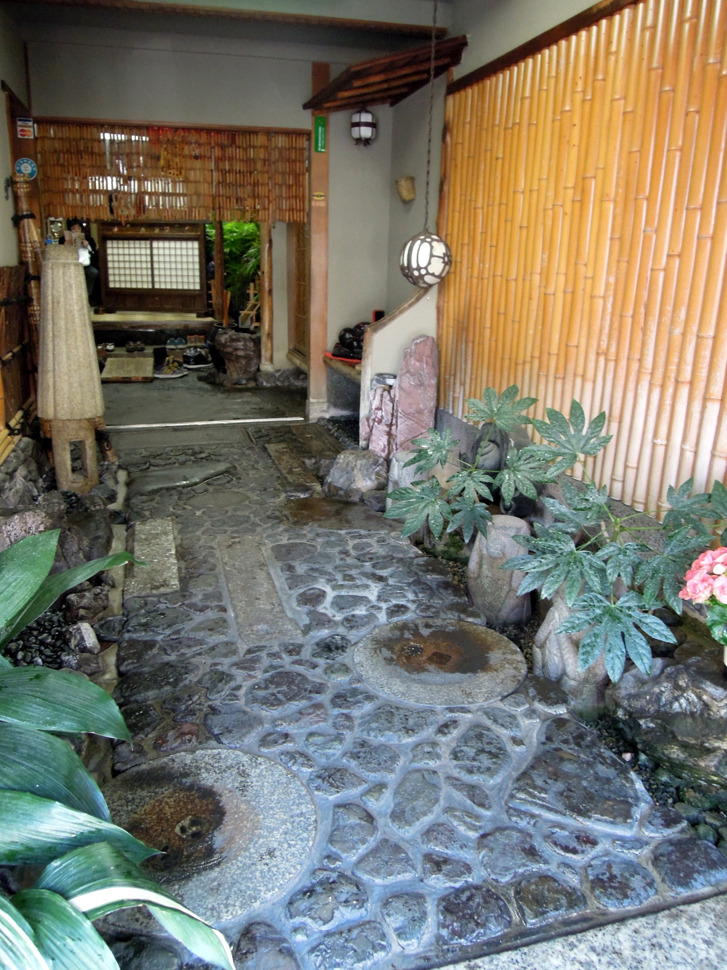 We’d watched other diners leave the room without paying, so when we were finished, we did the same, and returned to the front where Erik handed our money to the first lady who’d greeted us. Fortunately we had some idea of what it would cost, because there was no cash register and of course we didn’t understand her when she told us the total. She disappeared through a door and brought back our change, and we bowed at each other. When we turned to get our shoes we found that they weren’t where we left them; they’d been arranged more neatly along with the many new pairs of shoes. “It’s like a valet service,” Erik commented.