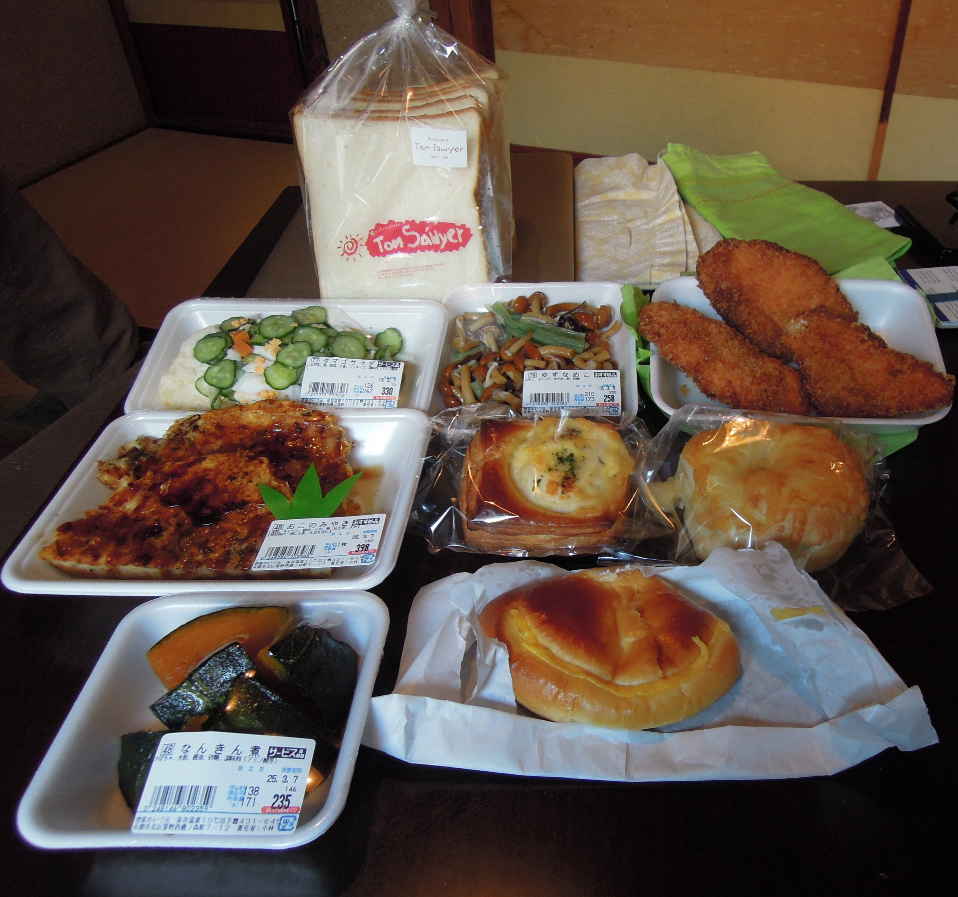 For dinner we decided to take a break from our usual nabe, so we went to our closest little stretch of Karamaguchi-dōri and explored the takeout shops. Actually I am not sure “takeout shop” is the right description; they are more a combination of takeaway and grocery. There are at least three of these within a couple of blocks, and they’re all a little different, but the same in basics. Each seems to be run by a single proprietor. Two have glistening fresh fish in refrigerator cases, the third does not, but has a much more extensive spread of deli-type dishes. All offer a small selection of normal grocery items, local produce, and fresh-made sweets (rice vinegar, eggs, udon, sweet potatoes, mochi) as well as homemade takeaway items like tempura, cooked beans, and all kinds of other things I can’t identify. We visited two of these places, where we had awkward but friendly interactions with the owners, and then we stopped at the supermarket and the bakery. We didn’t know what about half this stuff was when we bought it, which is part of the adventure!