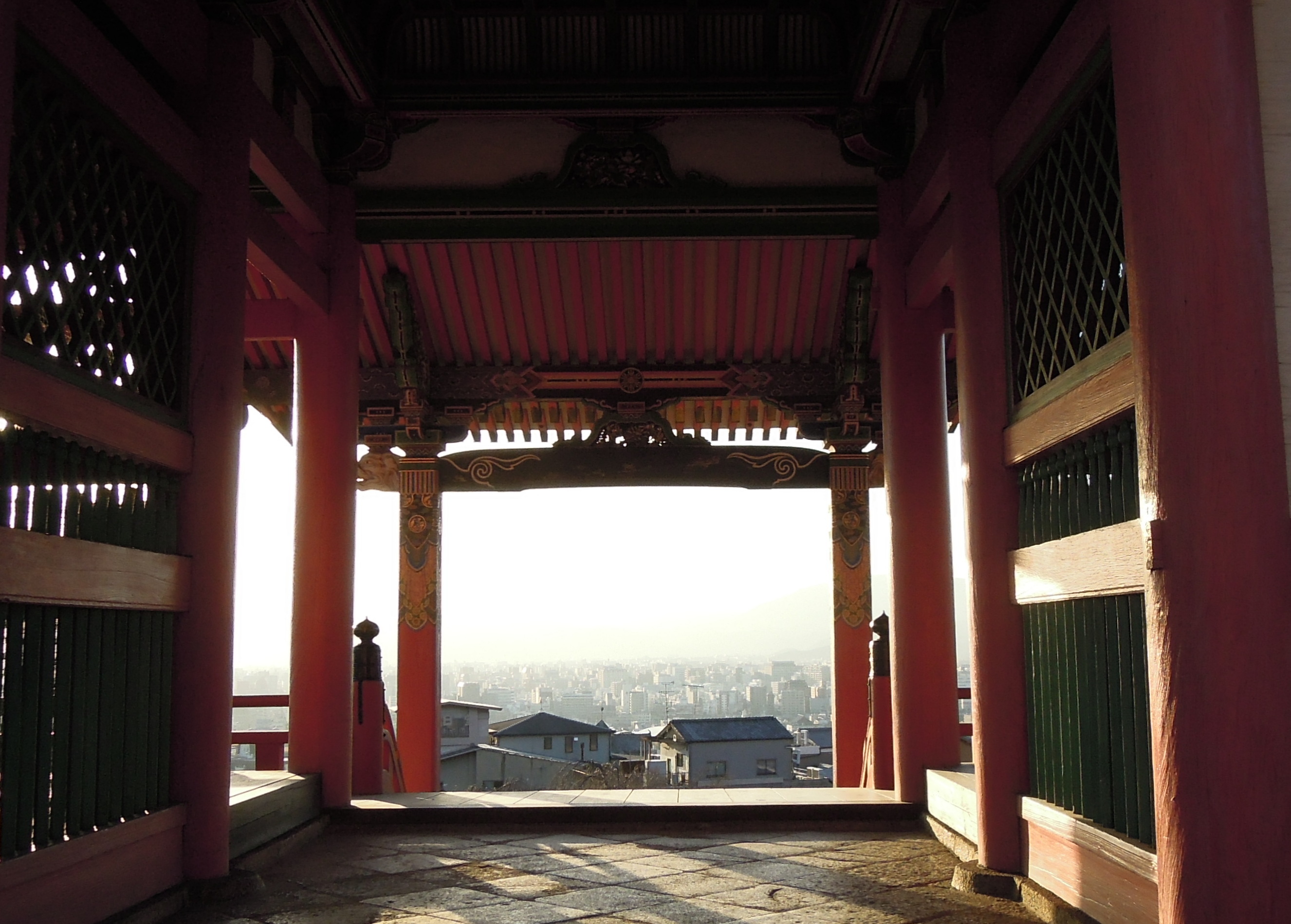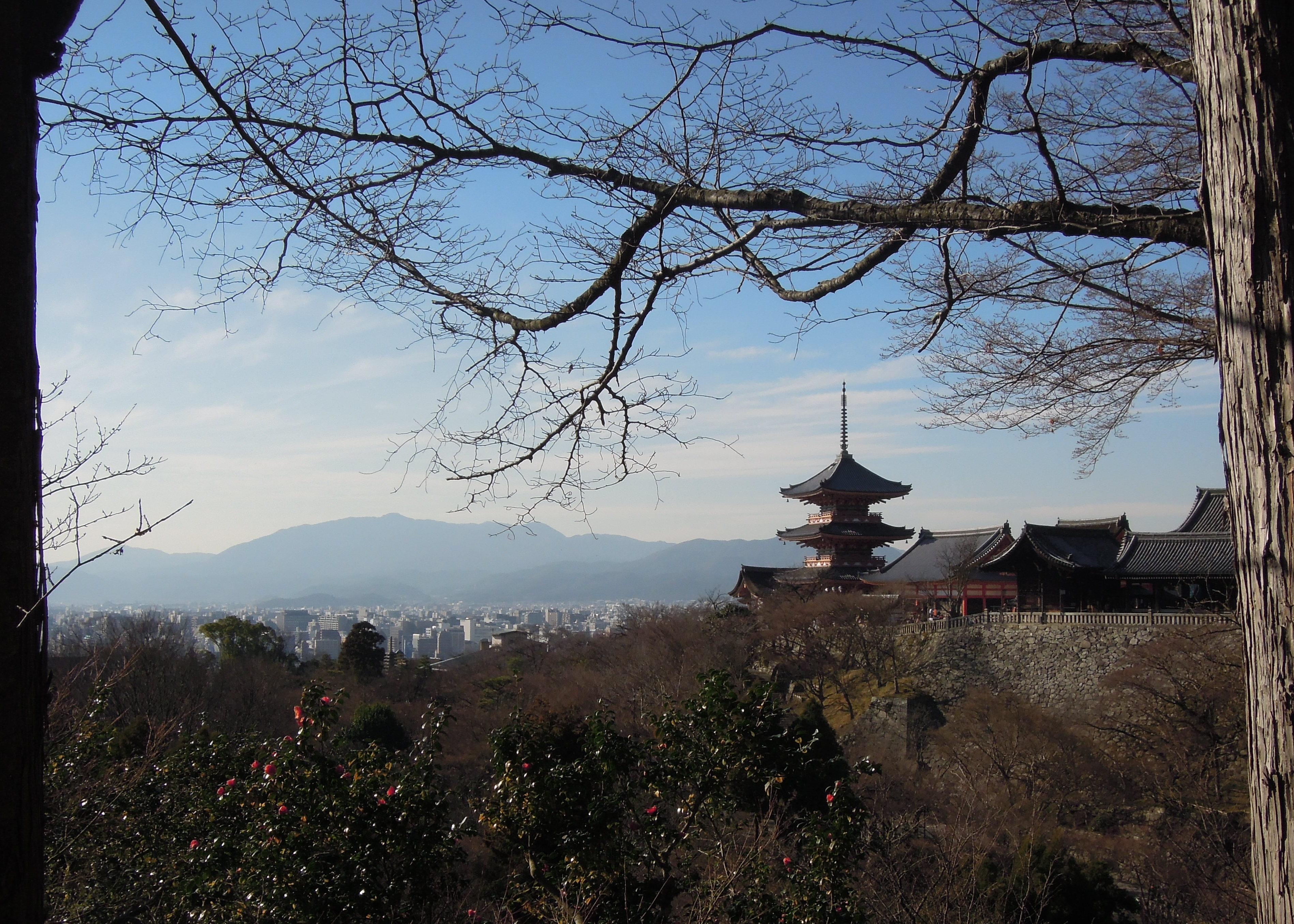 Kiyomizu-dera is one of Kyoto’s most famous temples. Founded in the 8th century, with the current buildings dating to the 17th century (and constructed without the use of nails), it perches on a hillside in the eastern part of the city. Here’s a dramatic photo from Wikipedia: