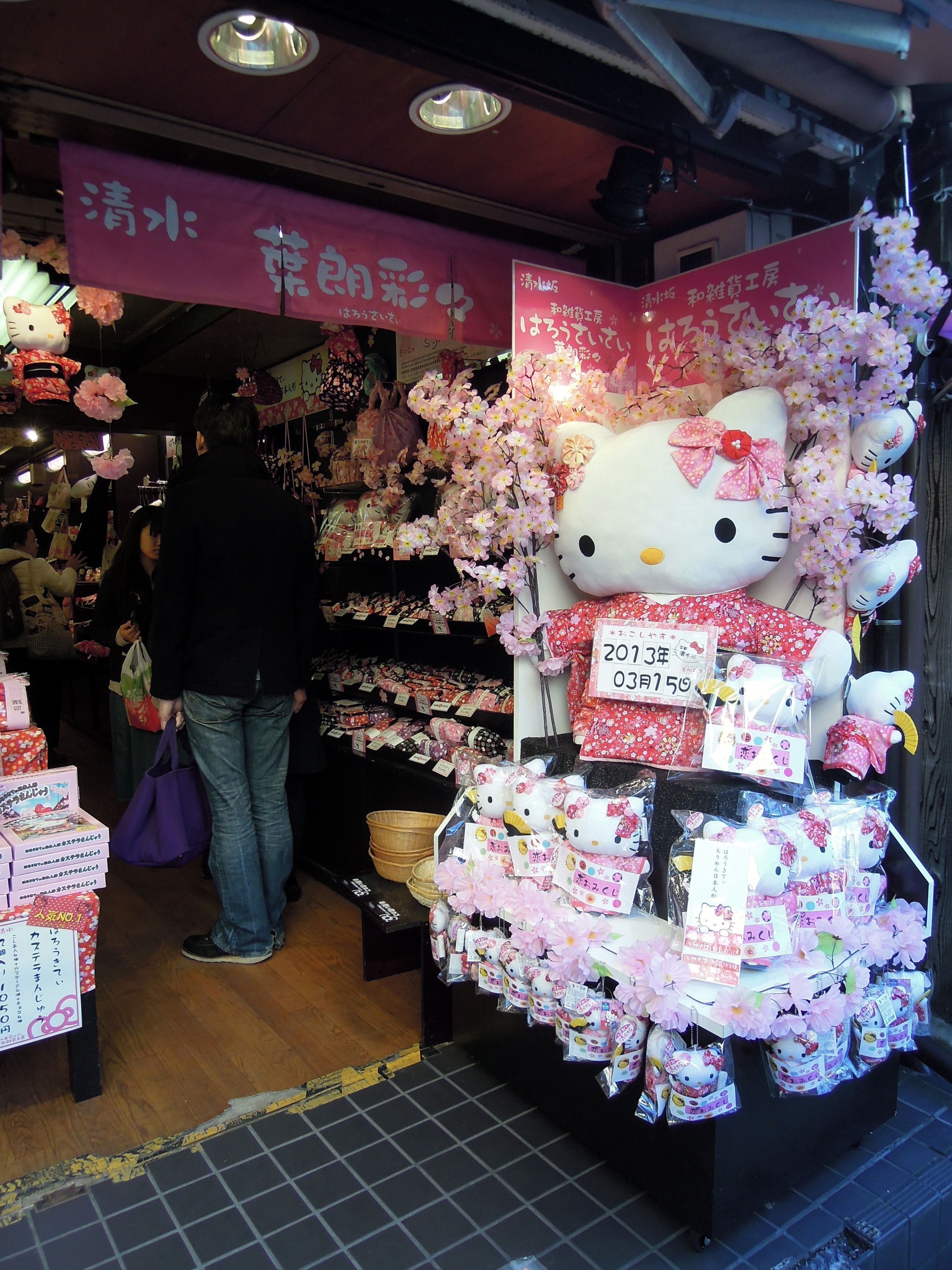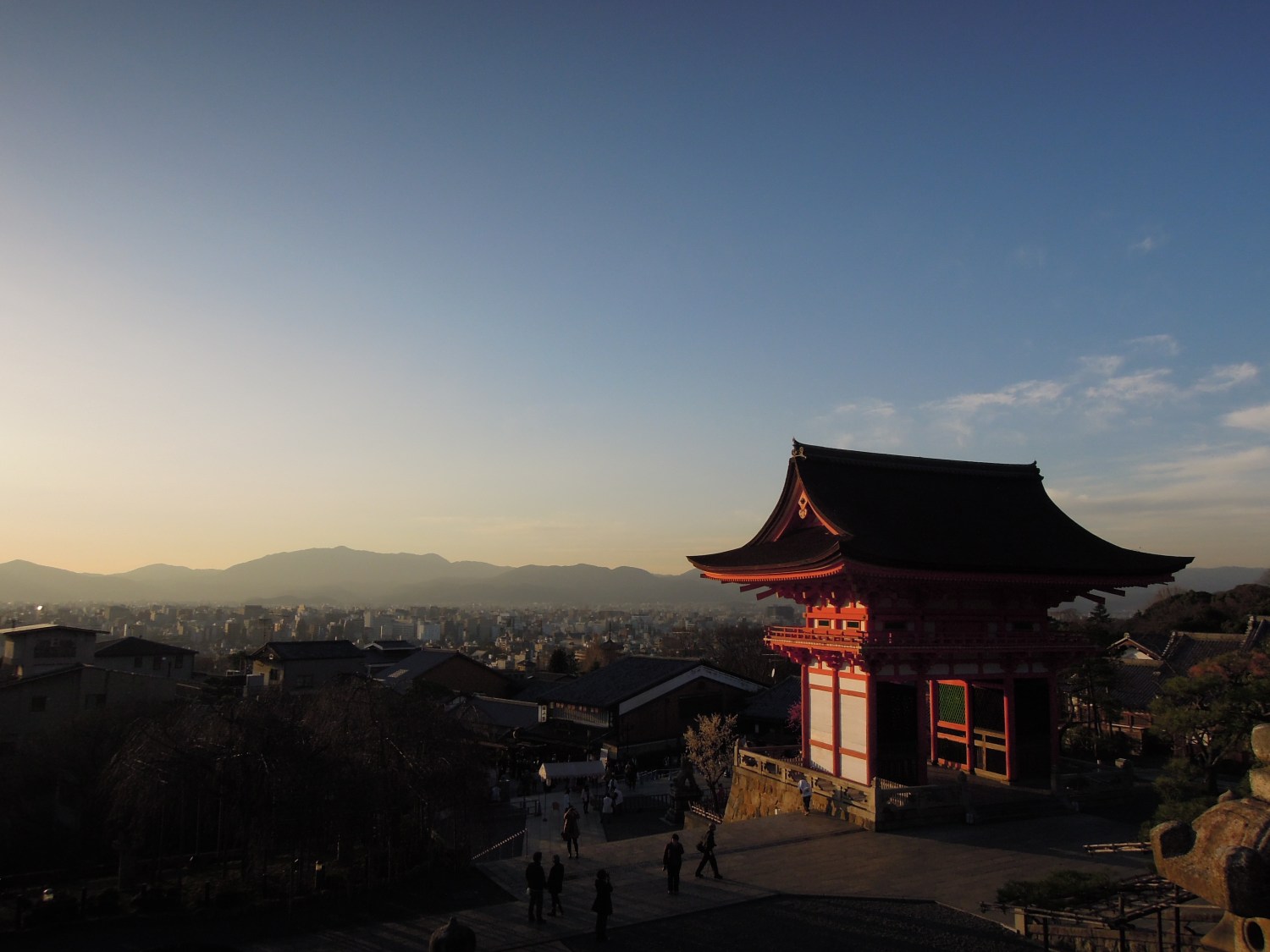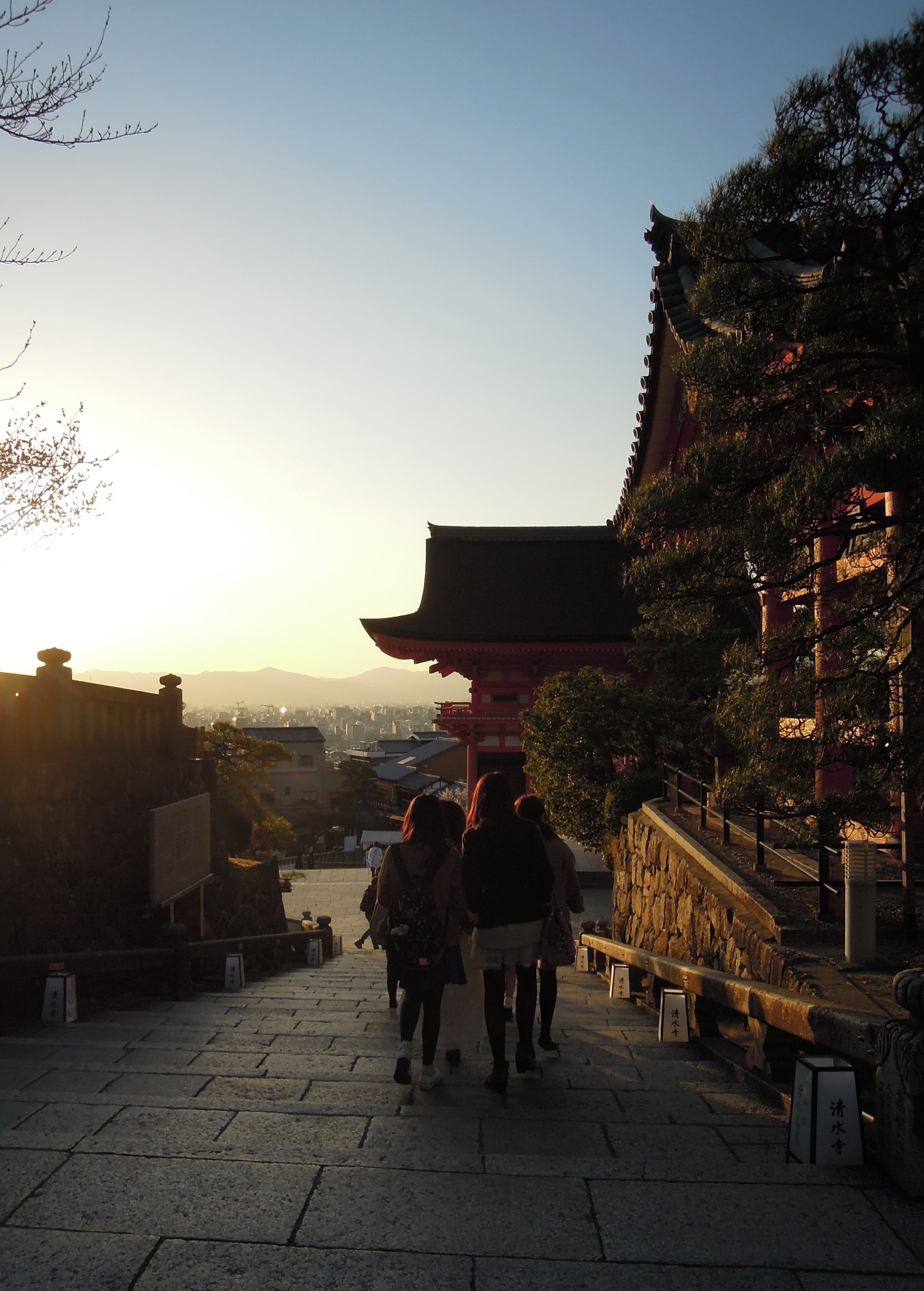 We set out well before sundown. The 206 bus dropped us off at the foot of Kiyomizu-michi, a narrow street that slopes gently up for 600 meters until reaching the main gate of the temple. As we neared the temple, there were more and more shops and restaurants, selling everything from cheap tchotchkes to fine porcelain to fishcake on a stick. The food shops handed out samples; we tasted chocolate and banana yatsuhashi, generous cupfuls of green tea, and delicate matcha-flavored langues de chat. Meanwhile, everywhere we looked there were slow-moving groups of local schoolkids and Taiwanese tourists in rented kimono.