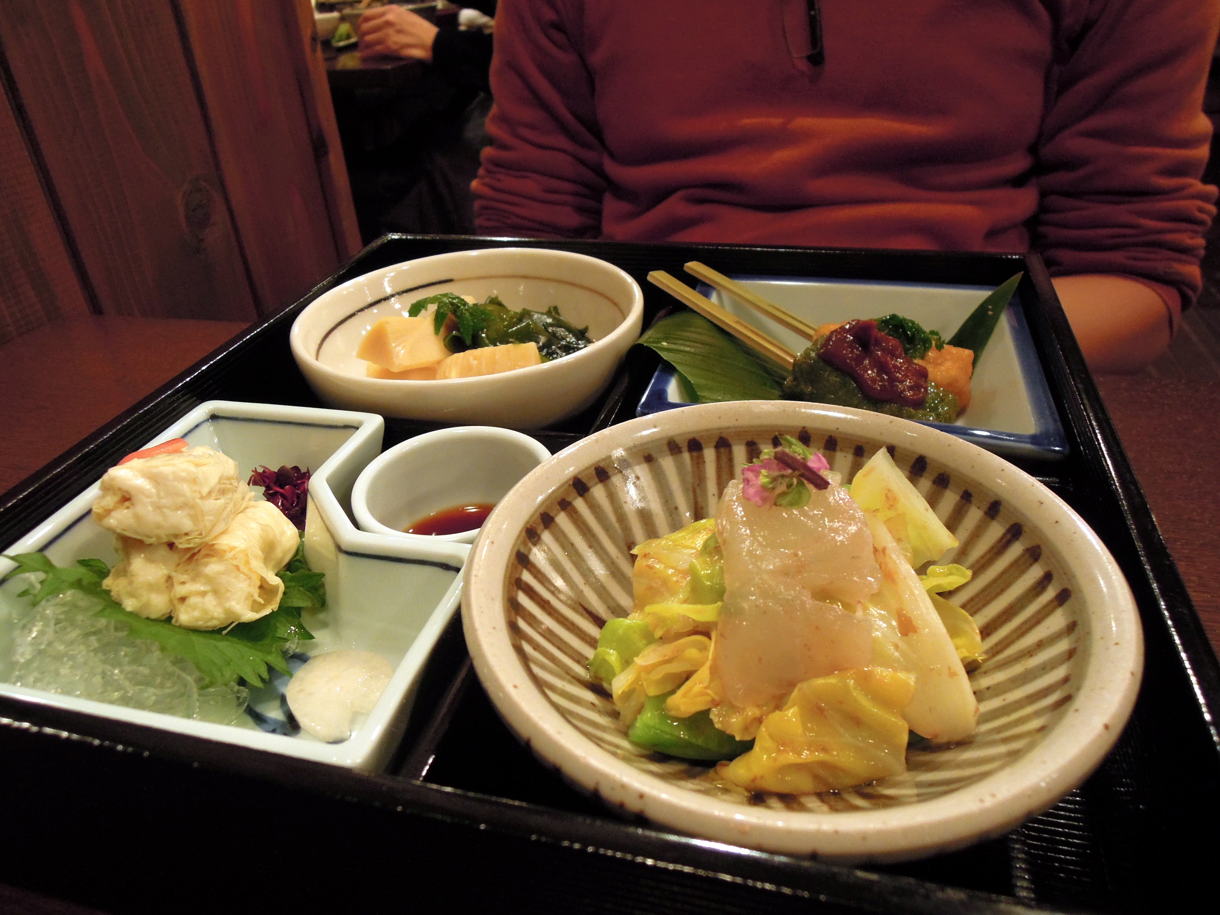 Erik’s set meal. Clockwise from top left: young bamboo and greens, savory mochi, raw fish and vinegared greens, tofu.