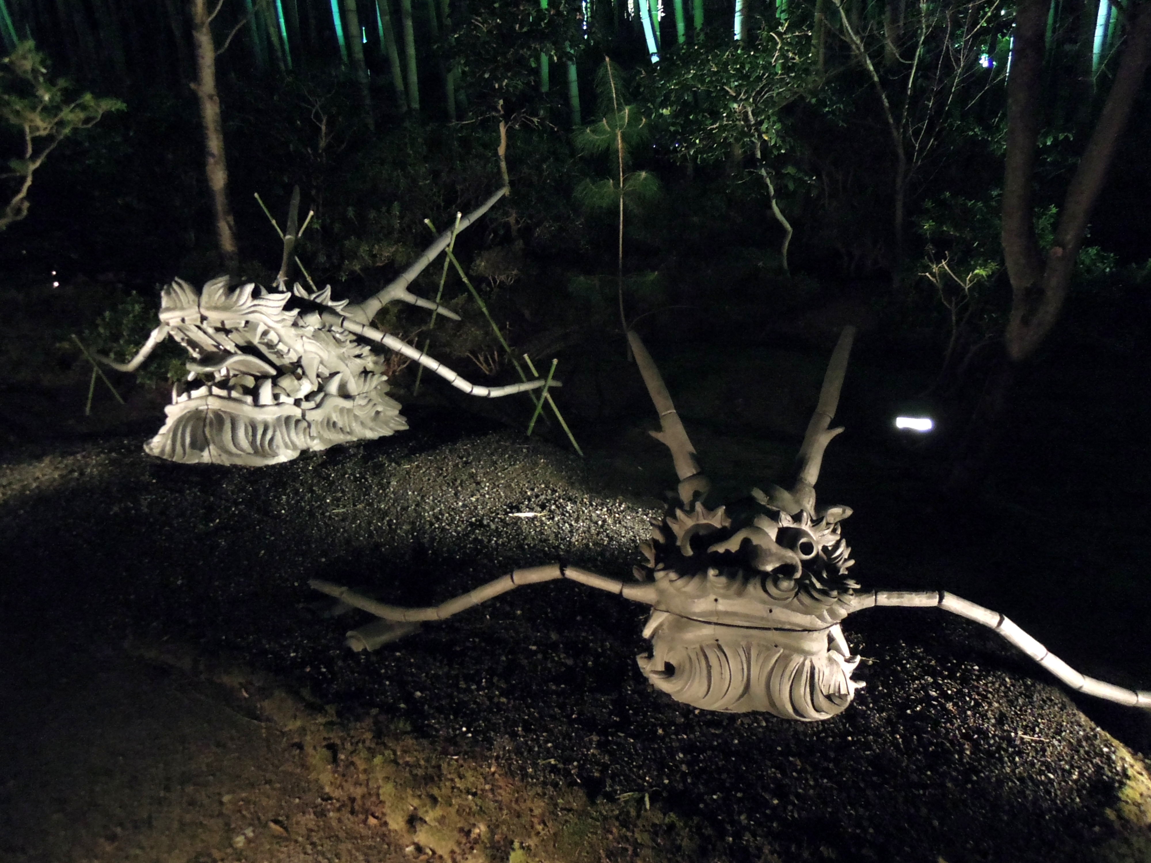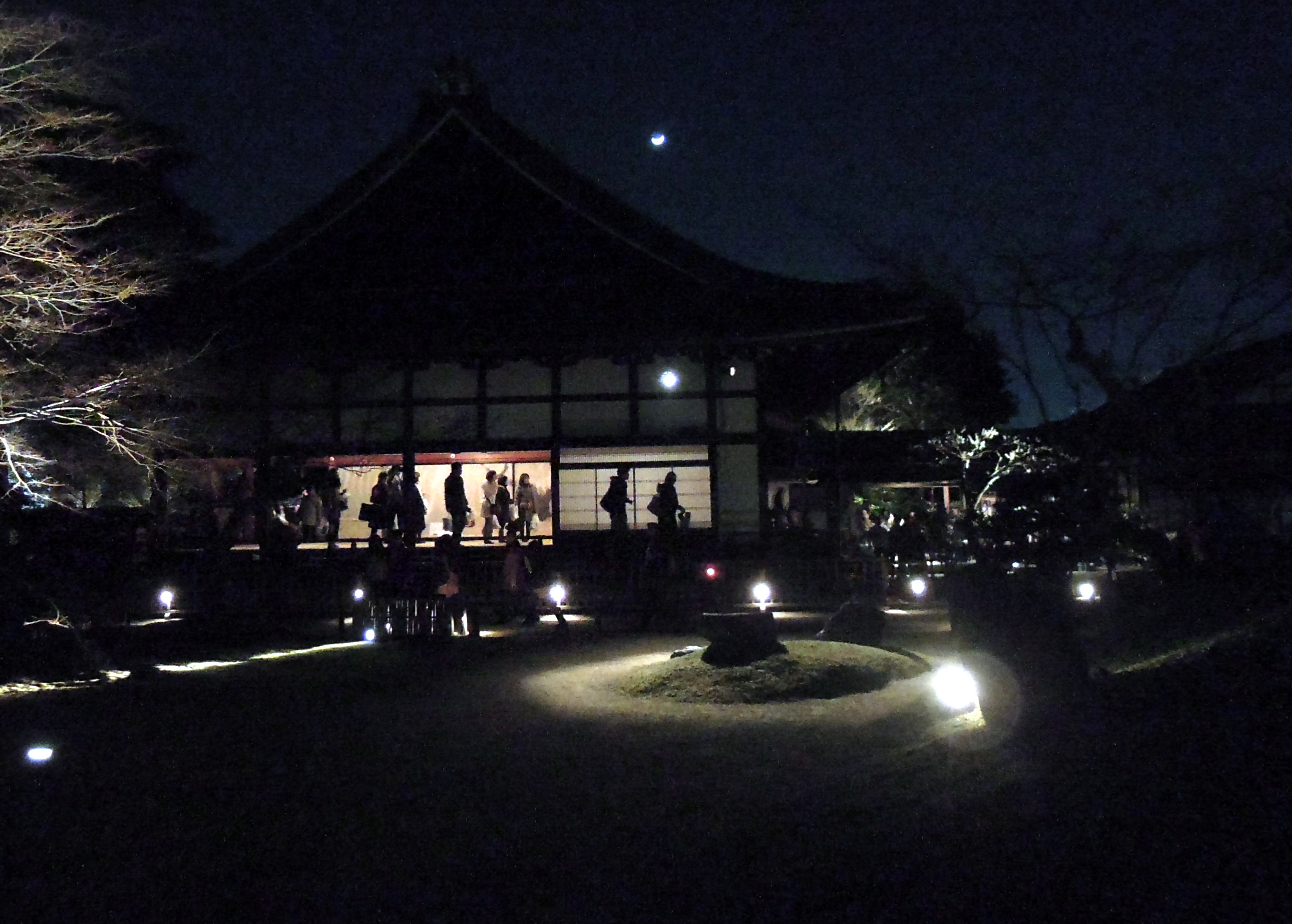 I think we missed a lot by not seeing the temple during daylight hours — the water features and maki-e lacquer were not so visible in the dark — but on the other hand, the nighttime atmosphere was very special. Inside the buildings we had to take off our shoes, which I liked very much for the quiet and the intimate feeling of walking around the tatami with all these strangers.