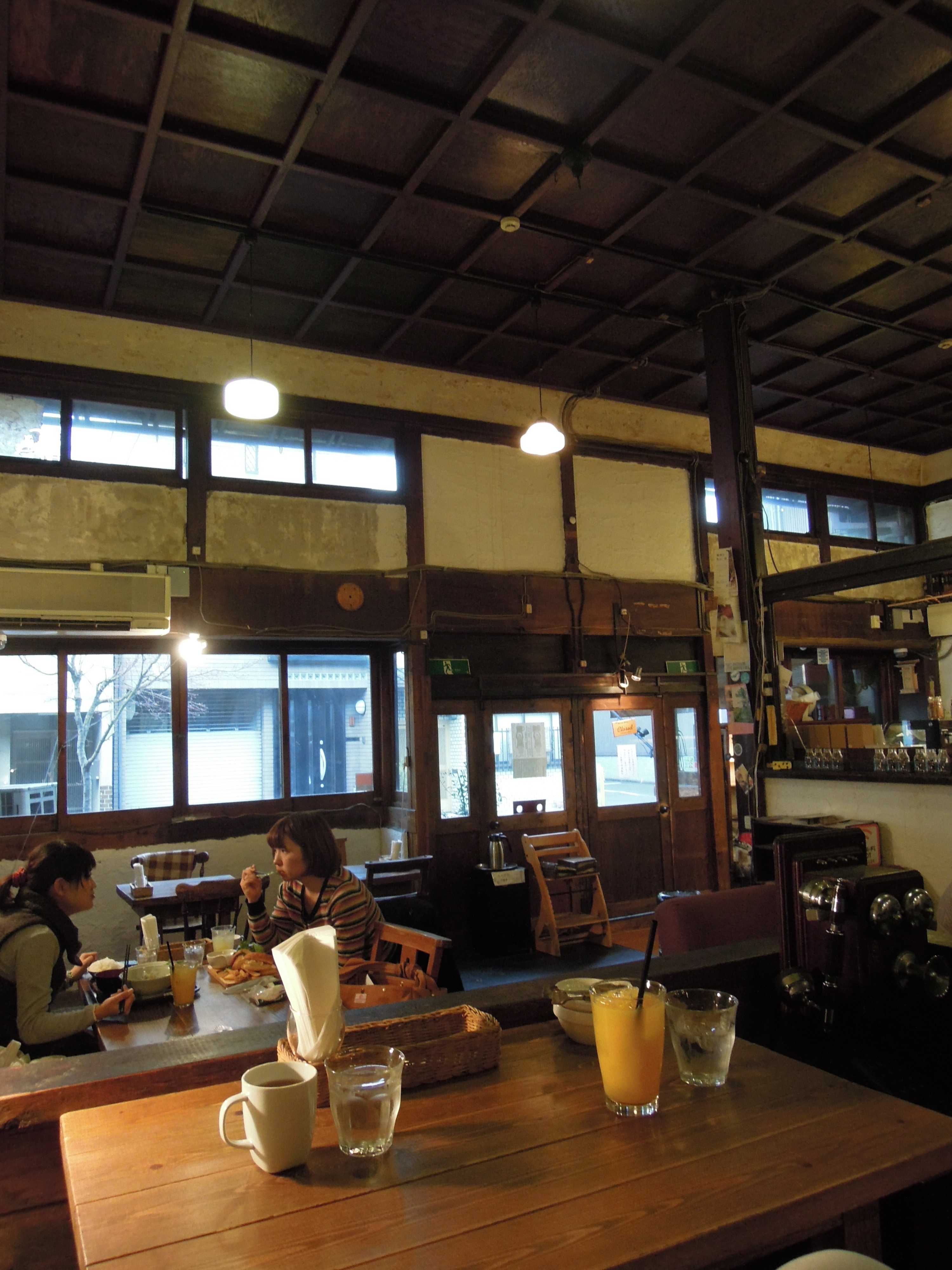 *Up until Sunday night we’d avoided English menus almost entirely. But that evening we went to a “New York style” restaurant in a mall, and the katakana menu nearly did us in. It wasn’t that we couldn’t sound things out — Erik could, though verrrry slowly — but that things are written as Japanese English, not standard English; to us, “sāroin” doesn’t immediately translate as “sirloin.” We had decided to just go with whatever, but when the waiter heard me say “B Set” instead of “B setto,” he switched to smooth, unaccented English and asked, “Would you like an English menu?” Our relief was comical. After that we decided we might as well ask for English menus when there are many dishes we can’t make out. So that’s what we did at Sarasa, and while there was no English menu, a waitress came by and explained the menu in English. But she simplified it quite a bit, so ultimately what she told us was exactly what we’d figured out on our own: a pork dish, a potato sandwich, beef udon. She did explain that the dishes came with our choice of drinks, so that was helpful. It’s good to know we can get by without English menus in many places, and equally reassuring to know that some restaurants do have them!