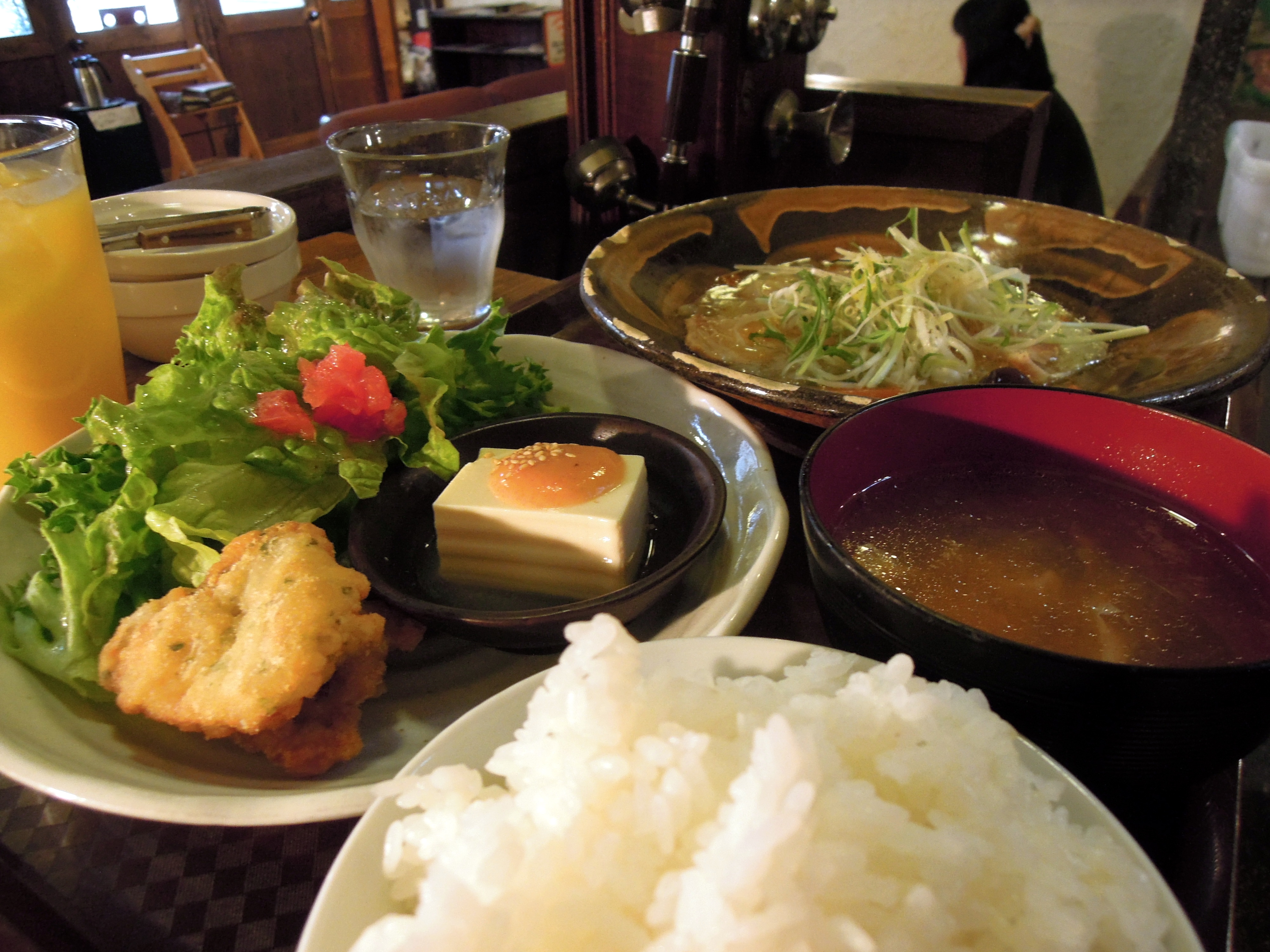 Besides the gorgeous surroundings, the food was excellent as well. The menu was simple, with only three choices. As usual Erik and I tag-teamed it, with me identifying pivotal kanji (“pork,” “beef”), and Erik deciphering the kana (“sanduichi,” “potato,” “udon”).* Each meal was delicious, filling, and beautifully presented, and only ¥900 (about $9.50).