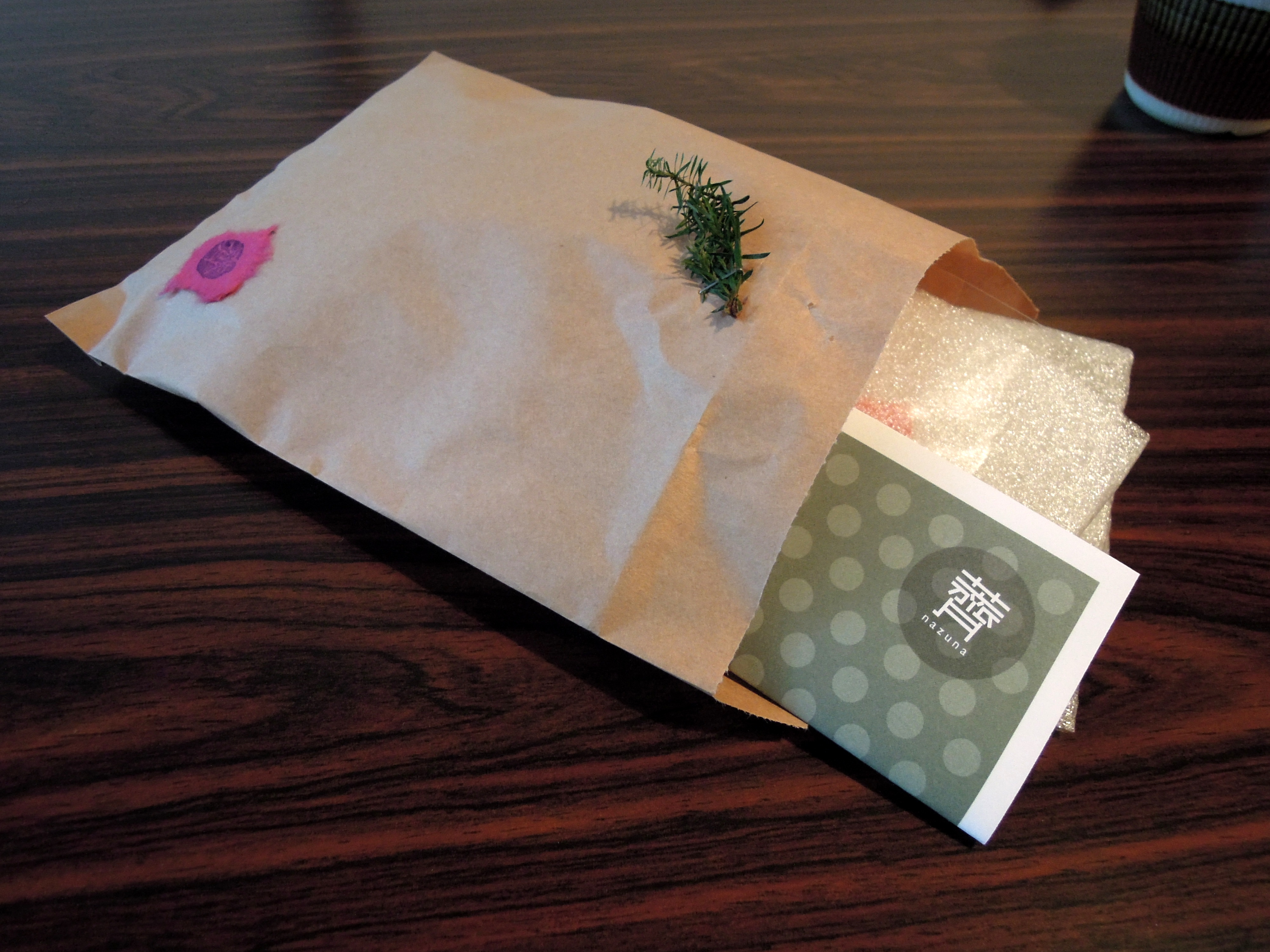 At one point the lady who ran the shop said something to me in Japanese, and when I said I didn’t speak it, she apologized and then offered one word: “handomēdo” (handmade). I finally decided on some jewelry and with great care she polished each piece before packing it up. As a finishing touch, she selected a little branch and stapled it to the bag. When I got home I realized it was a bit of real evergreen. It fills my nose with a smell of winter.