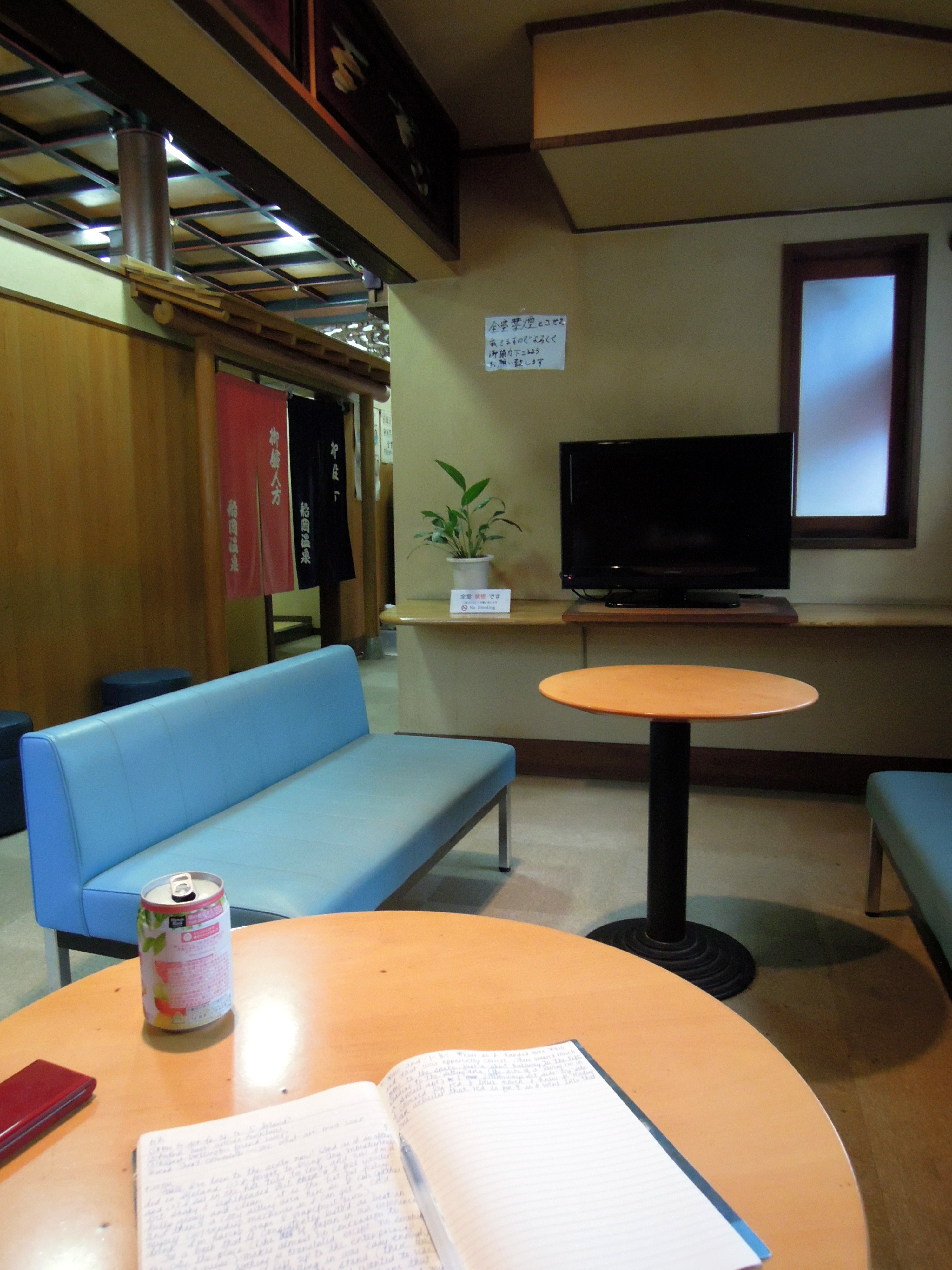 I sat a little too long in the tubs and got light-headed, so when I finished and changed back into my clothes, I sat in the waiting area and wrote about the experience, while downing two cold drinks from the vending machine (grapefruit, and aloe and white grape).