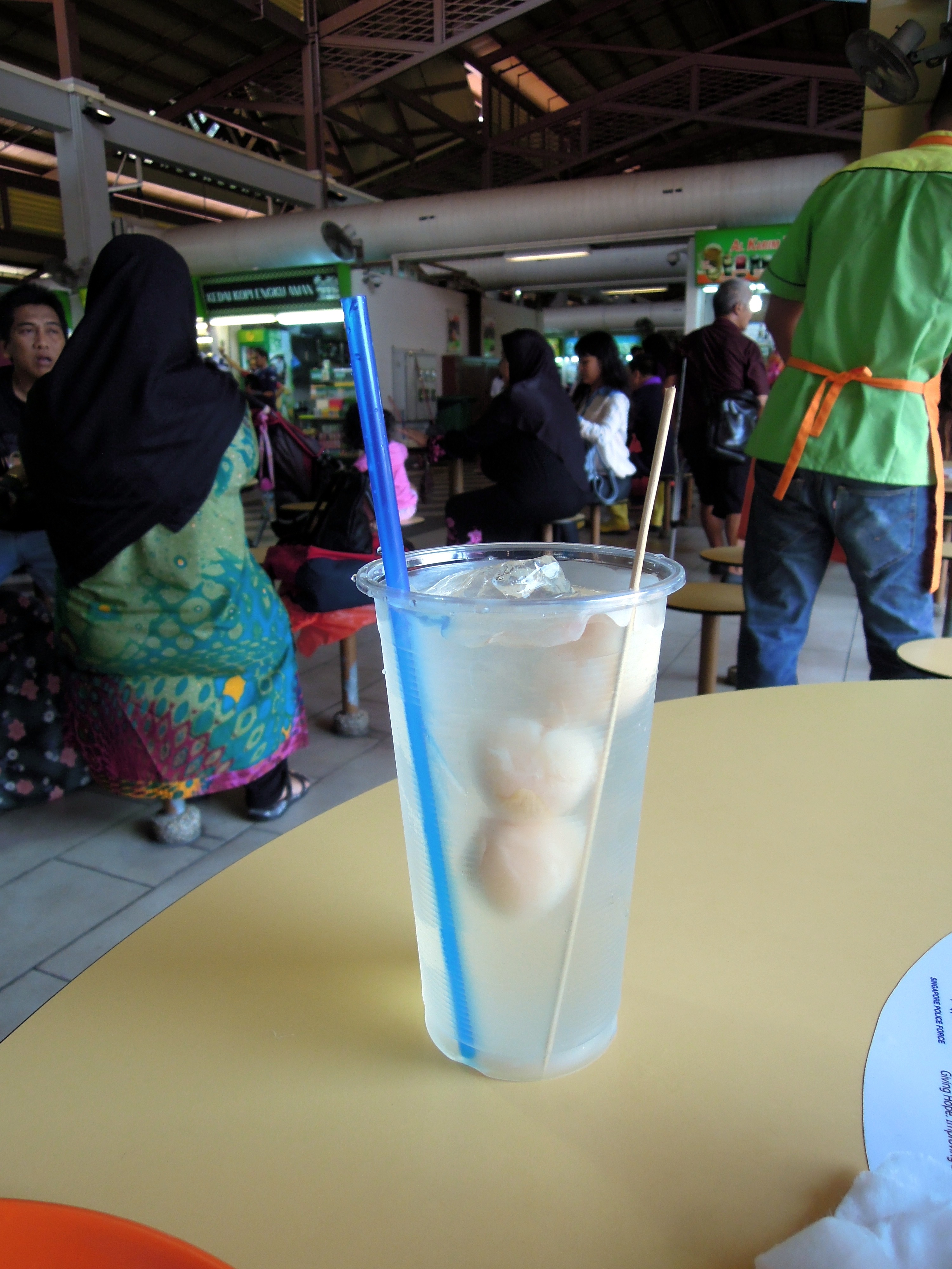 The food wasn’t mind-blowing, but it was tasty and hot, and very cheap — my plate was $2.60 SG, which is about $2 US, and it was $7 SG for two portions of chicken rice. If only there was air con, we could have stayed in the centre all afternoon, but alas, there were only ceiling fans and they weren’t quite enough for us. So we left, first buying another two drinks:ย grass jellyย for Erik, sugarcane juice with lemon for me. As in Istanbul, fresh juices and soft drinks are thankfully inexpensive, so it’s easy to stay hydrated!ย These were about $1 apiece.
