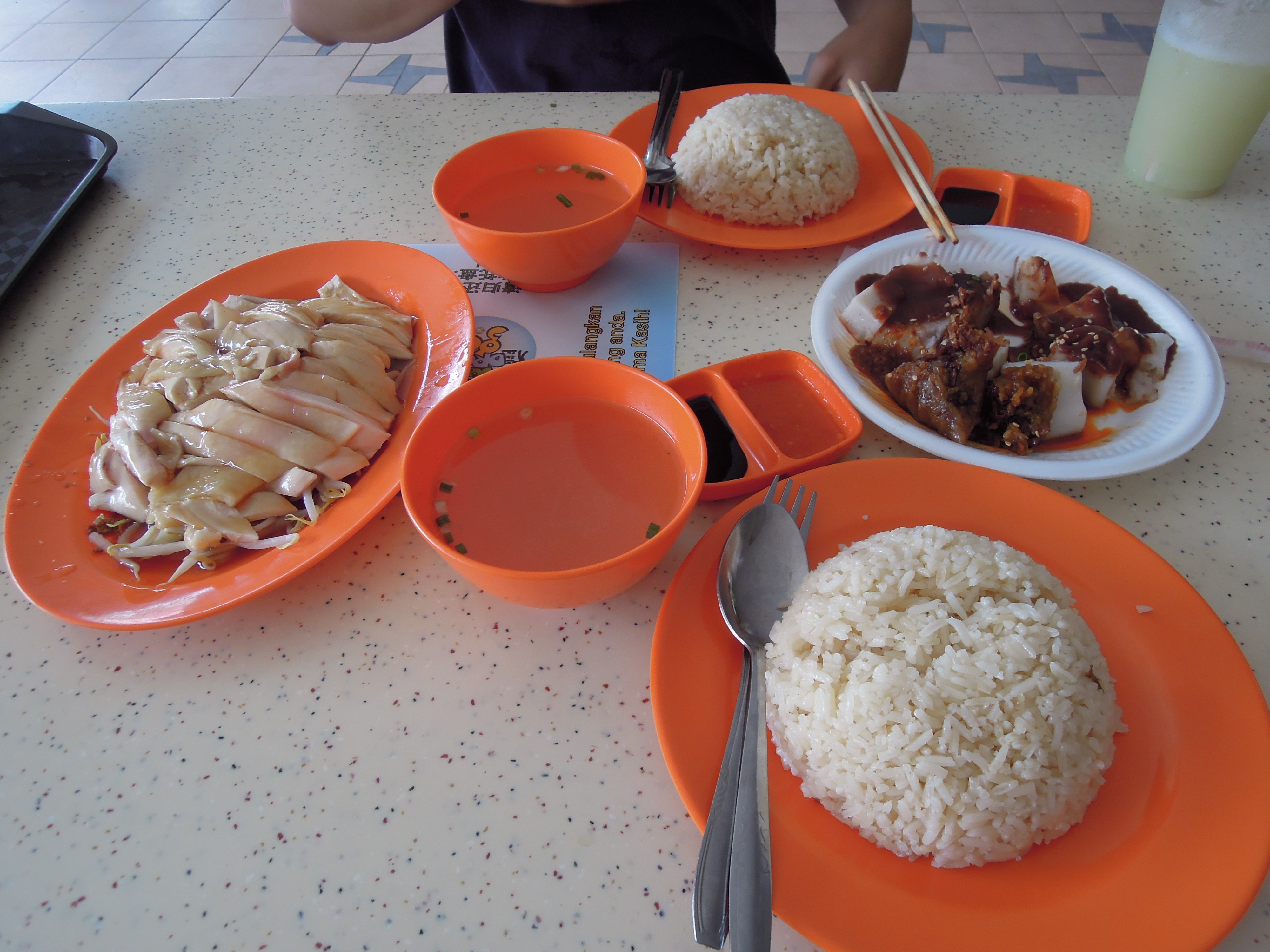 We were completely wowed by the centre, which had dozens of stalls selling drinks, snacks, and other food. After first buying fresh juices (pear and starfruit) to cool ourselves off, I stopped at a dumpling stall with strings of zongzi hanging from the ceiling, and Erik queued for Hainanese chicken rice.