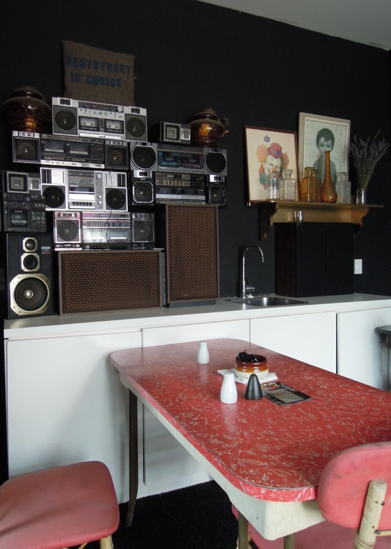 Raspberry lamington milkshake, its chocolate splashes matching the décor: