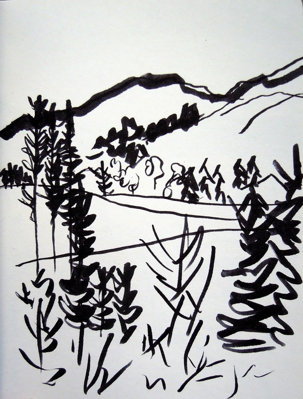 We spent the rest of the afternoon at the cottage, doing laundry, visiting with our kind hosts. I attempted to make a painting — a mad idea in the cold, really, and I didn’t quite realize the water-absorbing properties of my Japanese sketchbook. But at least I tried, and that was what I wanted: not a good picture necessarily, but a shot at capturing that wintry landscape.