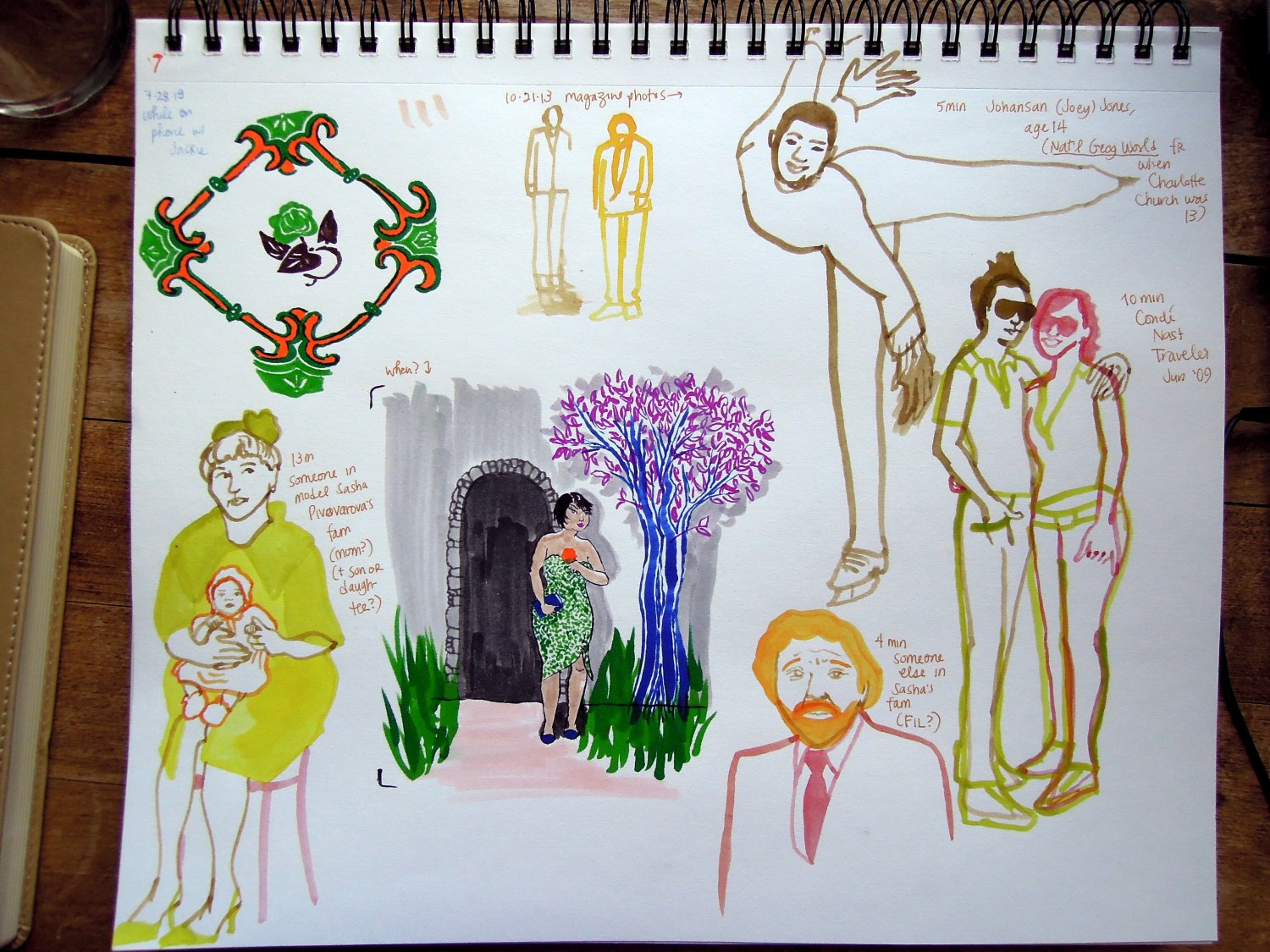 Some of my recent sketches from magazine photos (sharing page space with older doodles) — the ones that make me want to do something more: