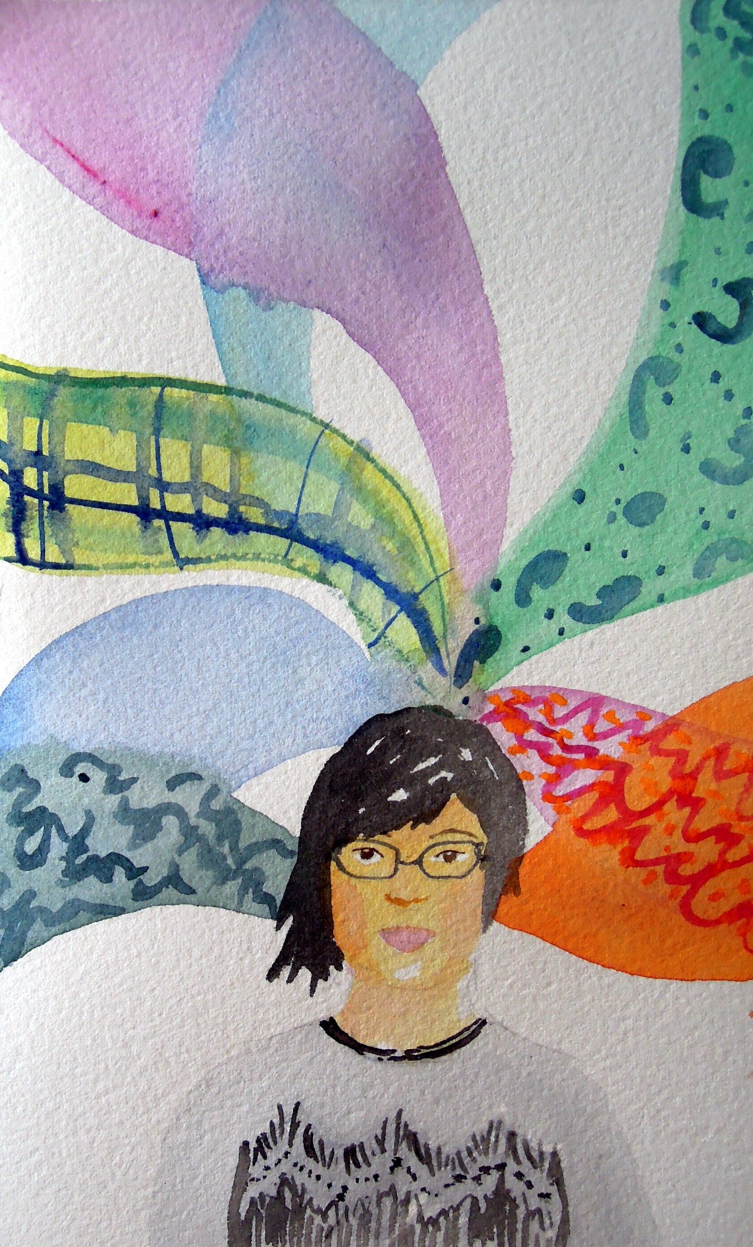 As to drawing and painting, if I’m out, I sketch with Marsgraphic markers in a plain Moleskine-type book. If I’m at home, I don’t have a dedicated painting space, so I blue-tape a piece of watercolor paper (usually cold-pressed, which is lightly textured) to a lightweight drawing board and prop it up on a bin and the edge of my desk or dining table, spray my palette with water, put on — rather loud — some slightly strange music like Sapporo Safaris or Jolie Holland or this gorgeousness or something I can rock out to, set my stopwatch, and go. I get up every now and then to stretch, pee, or drink some water, but if I leave the picture, I lose the mood, so I try to do everything in one go. This is not the best because — as with writing — I lose steam after about an hour and a half, but I’m hoping my stamina will increase with practice. It has done, in the past. And then I try not to use my hands too intensively after that, which doesn’t work so well if I’ve procrastinated and am painting right before it’s time to make dinner.