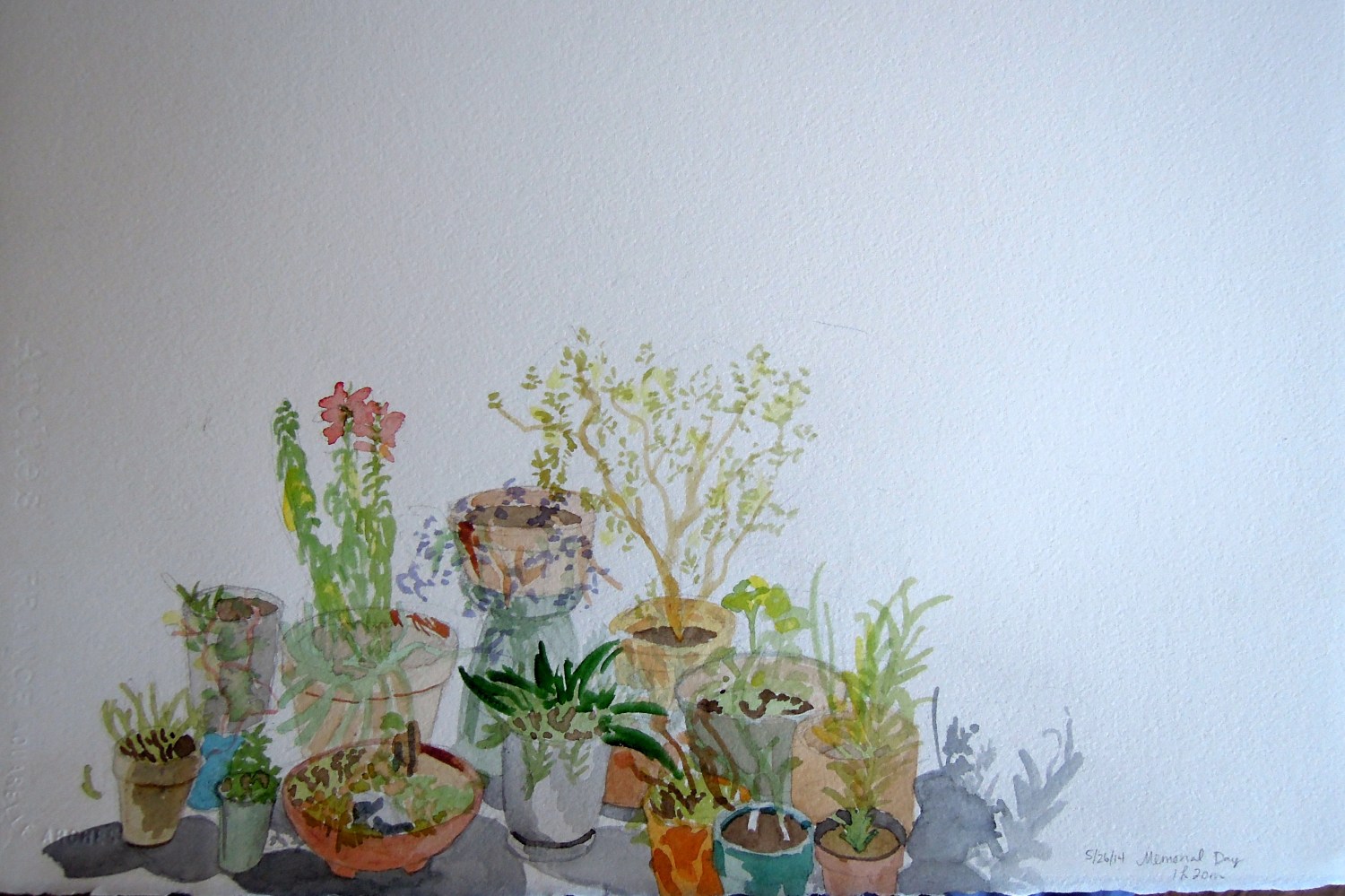 The arrangement makes me want to fill the entire wall… but if I don’t want to lose interest, I’m going to have to come up with new approaches to the subject. This was my attempt, early this week: a sketch of my deck garden, painted at the cost of a light sunburn (I lost track of time).