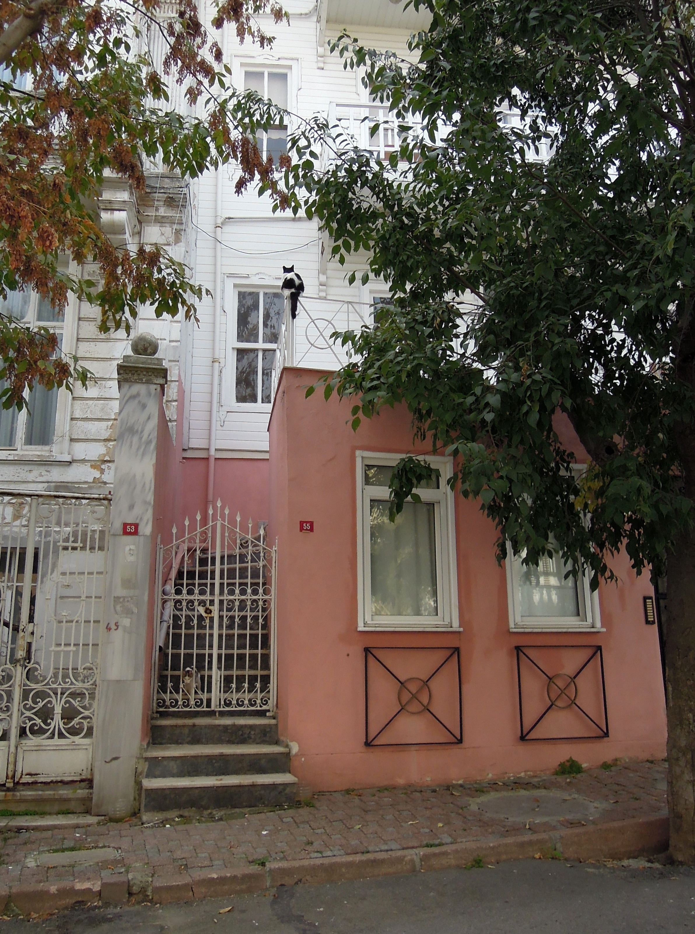 Cow cat perched above a pink building, Heybeliada, Princes Islands, Istanbul