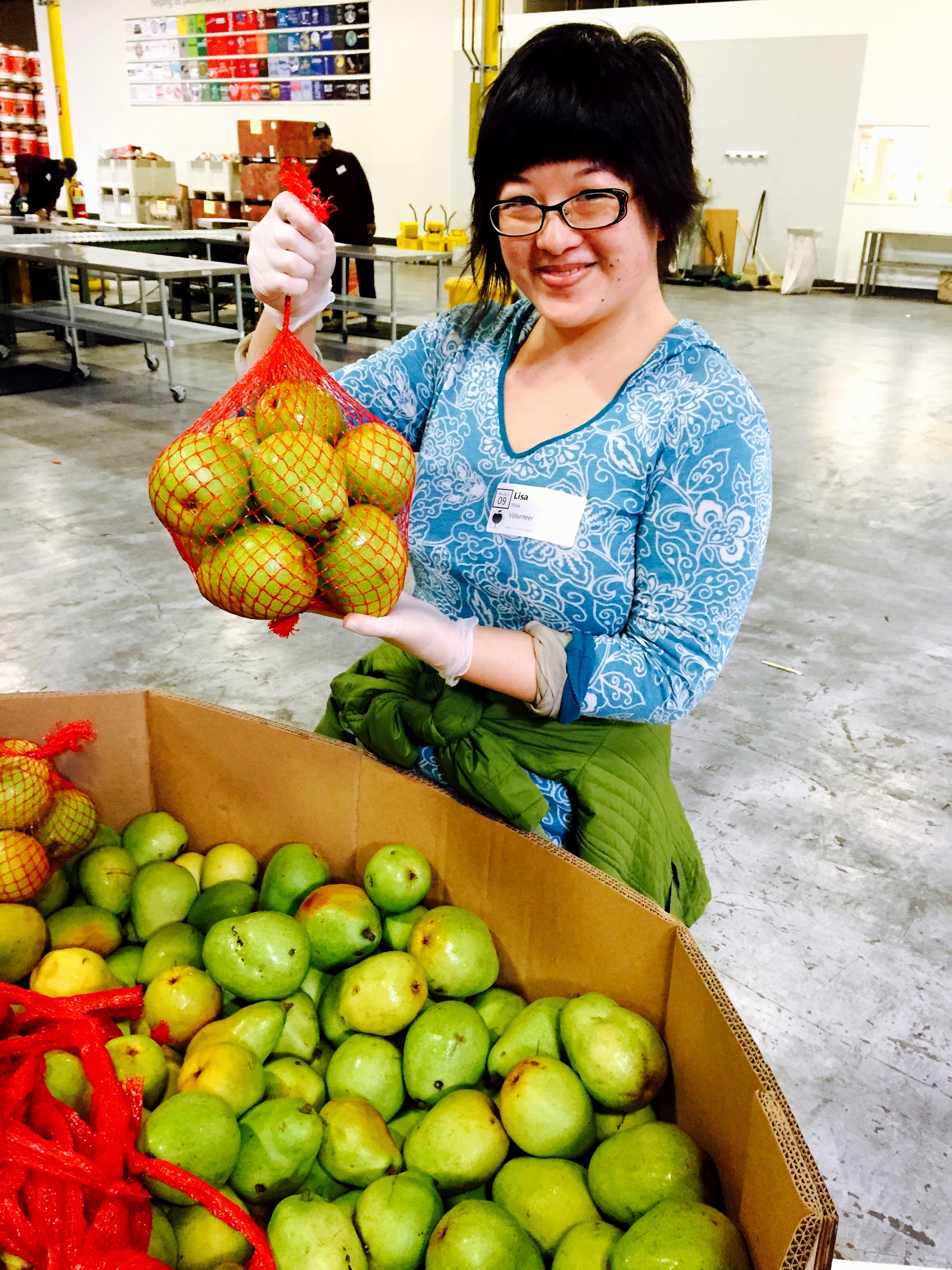 Lisa with a mesh bag of pears at the Alameda County Community Food Bank