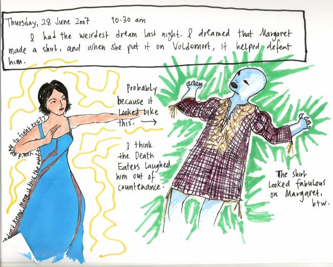 A few notes: 1. The Dark-defeating shirt is meant to be a sheer, iridescent burgundy-black, with gold embroidery. I don't …